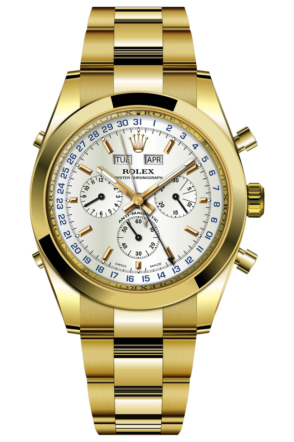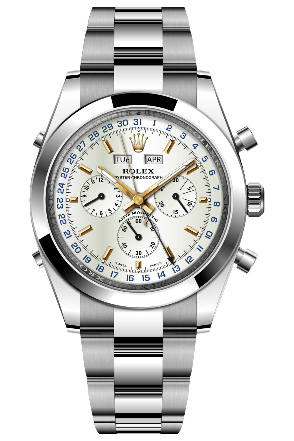 Now, Mr Dufour, would it be possible to take a modern-day Daytona, keep its automatic movement, strip off its ceramic bezel, remove the crown guards, replace the screw-down pushers with old-fashioned pump-pushers, as a basis? And would it be possible to add a calendar function, in the same vein as the Killy, with two apertures for the day and the month, while a fourth centrally mounted hand indicates the date? How nice would that be? We thought we would love it, so we messed a bit with Photoshop and guess what… We really love it!