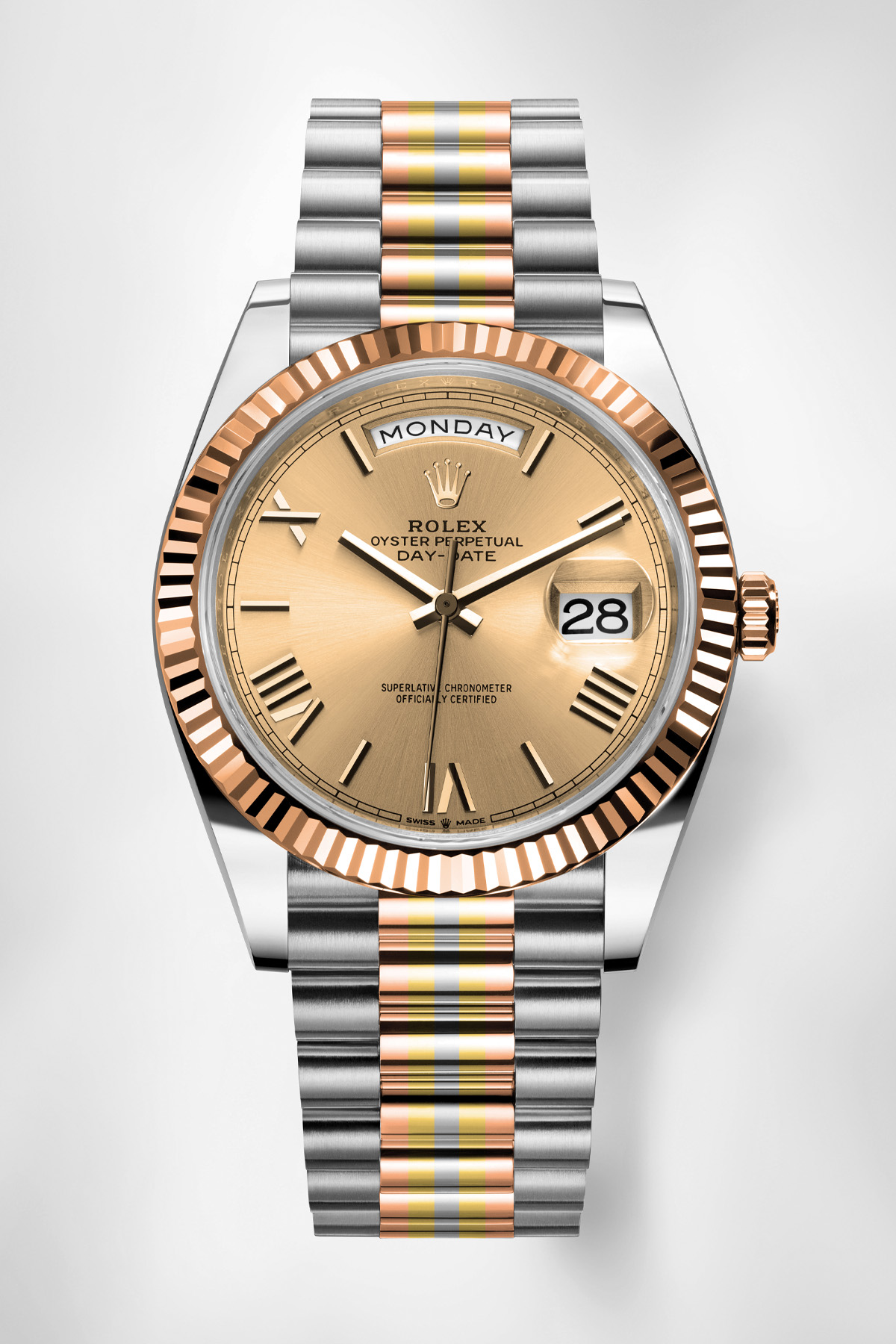 For the last of our 2023 predictions, we’ve decided to go wild… To do something that once existed and that many of you might have forgotten or simply never encountered. Of course, we’ve made it more modern, but still, the idea was to bring back a typical 1980s look. And we’re not talking about a two-tone style but a showy three-tone style that appeared on the Day-Date Tridor, mixing white, rose and yellow gold on a single watch. The idea, back when these watches were produced (late-1970s to early-1990s), was that of a white gold Day-Date with a yellow gold fluted bezel worn on a President bracelet in white gold, with a central link alternating bands of rose, yellow, and white gold. And often, a gold-toned champagne dial too. You can’t get more Gordon Gekko than that…