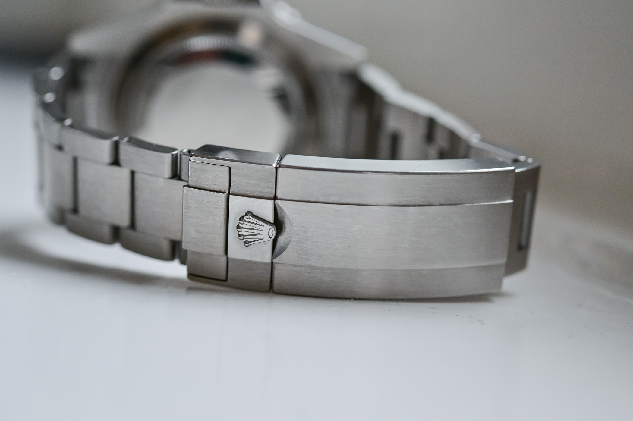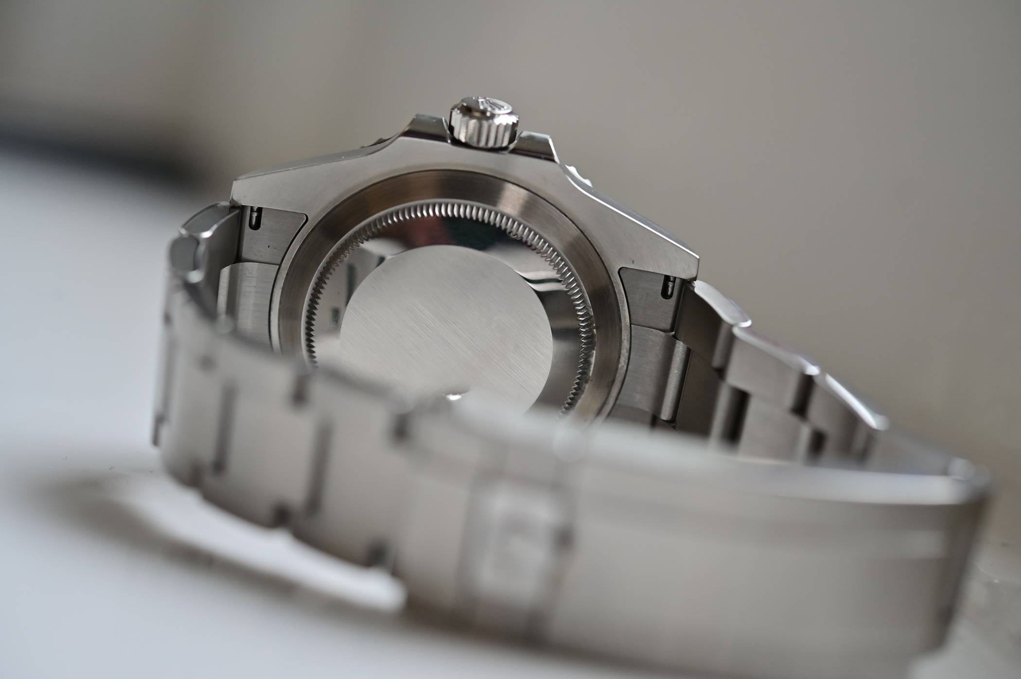 The rest of the case, or at least its execution and the specifications, haven’t changed majorly, however. The Submariner is still true to its spirit, that of a very capable dive watch but also a fairly luxurious sports watch. Made of Oystersteel (the internal name of the 904L stainless steel alloy used by the brand), the case combines straight brushed surfaces on the flat areas and polished accents on the sides. As with all modern models, no more polished bevels on the side of the lugs (sadly). The crown, the so-called Triplock, screws down and is well protected by lateral guards. The caseback is a simple fluted solid steel piece, typical of Rolex’s production. Both guarantee a 300m or 1000ft water-resistance, more than enough for recreational and professional divers (and if you want more, the Sea-Dweller and Deepsea will answer your needs).