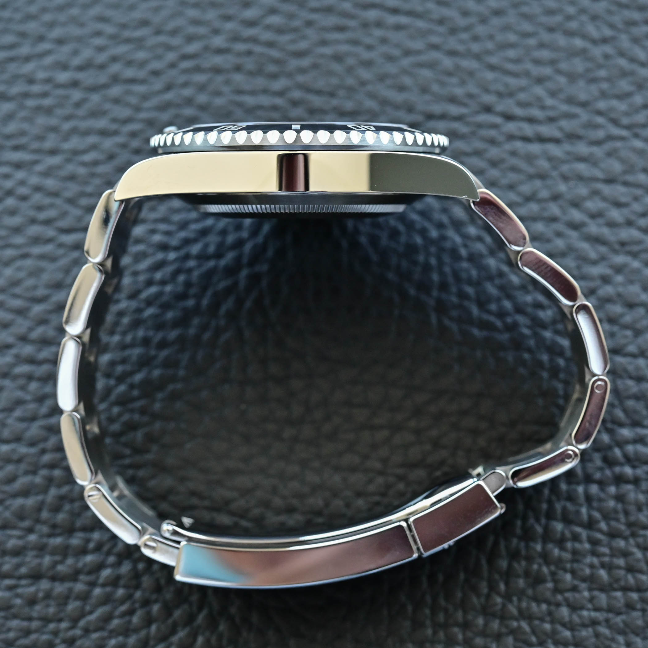 The second major update to the Submariner Date in 2008 was the introduction of the ‘Super Case’. Still measuring 40mm in diameter, the Oyster case was made slightly squarer, with thicker lugs and a chunkier overall profile. The changes were subtle but are immediately obvious when compared side-by-side with a previous generation Submariner. This new case style was also first introduced on the 50th anniversary GMT-Master II mentioned above and was Rolex’s solution to the ‘big’ watch trend, which was gaining momentum at the time. The result is a bulkier, more masculine watch that is still very wearable and comfortable on the wrist.