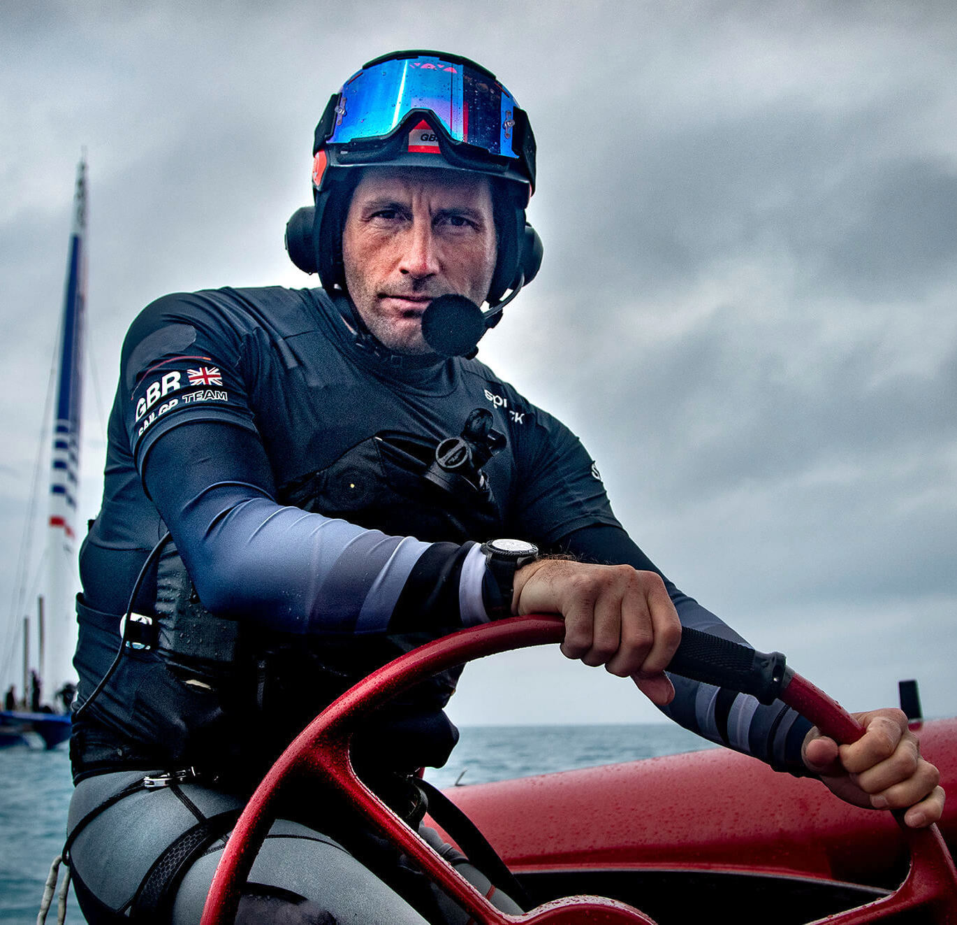 Sir Ben Ainslie at the helm during a training session in November 2020 with the Rolex Yacht-Master 42 Titanium No-Date Prototype on the wrist. Image by Ineos Britannia Team / C GREGORY