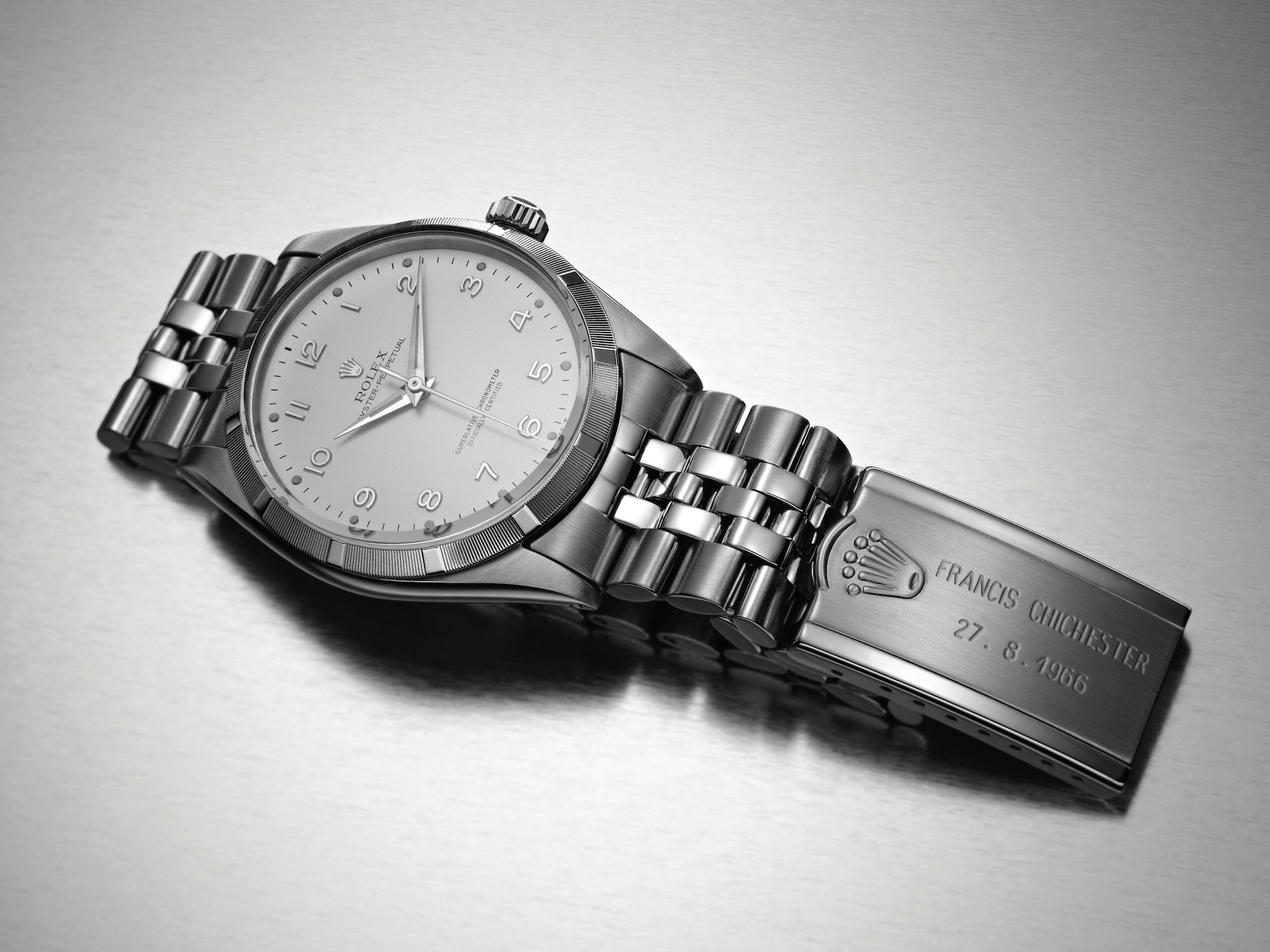 Below: Sir Francis Chichester, the first person to sail single-handed around the world from west to east, a nine-month journey from August 1966 to May 1967. Next to it, the Rolex Oyster Perpetual he was wearing on his wrist during this voyage.