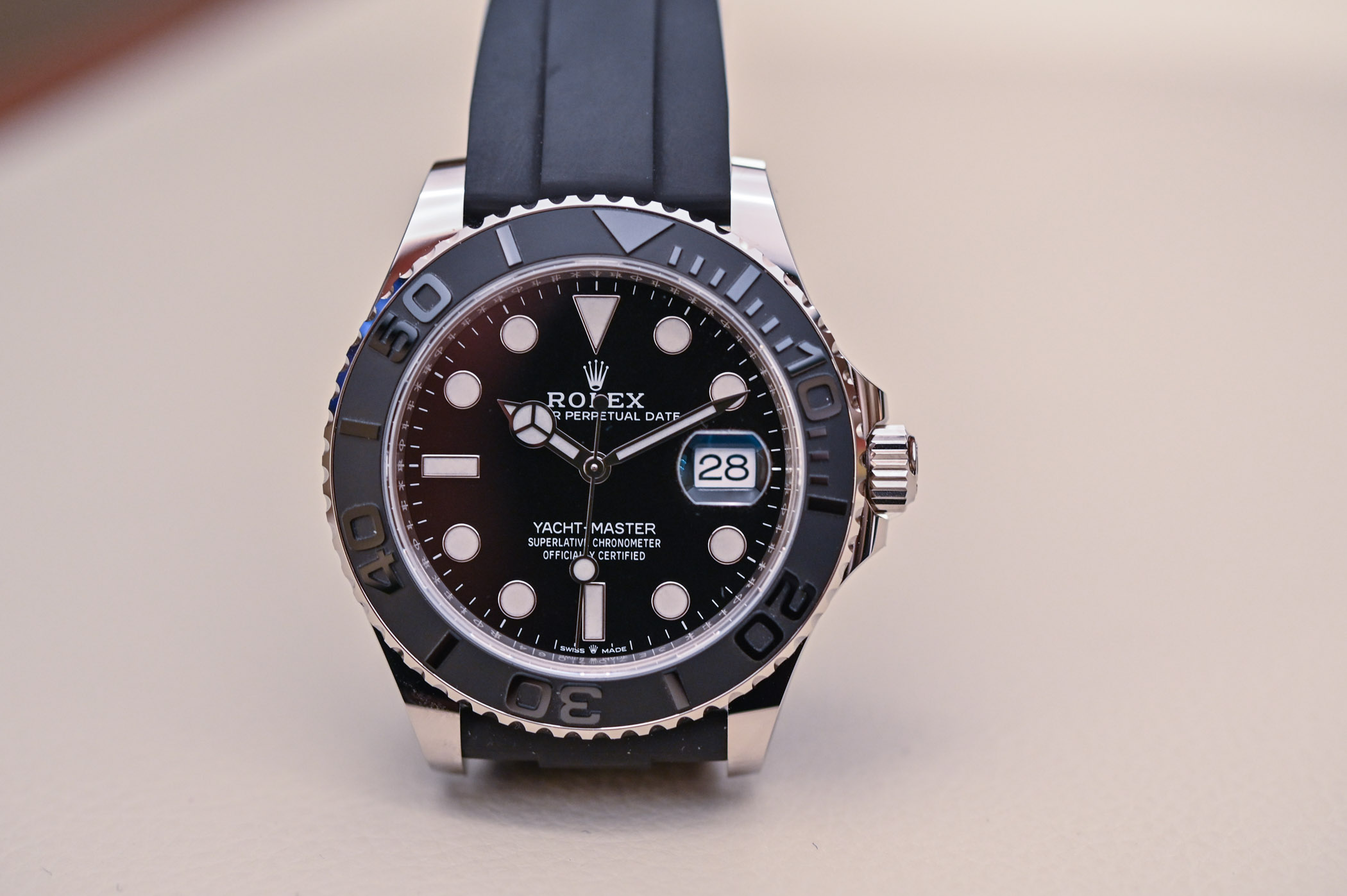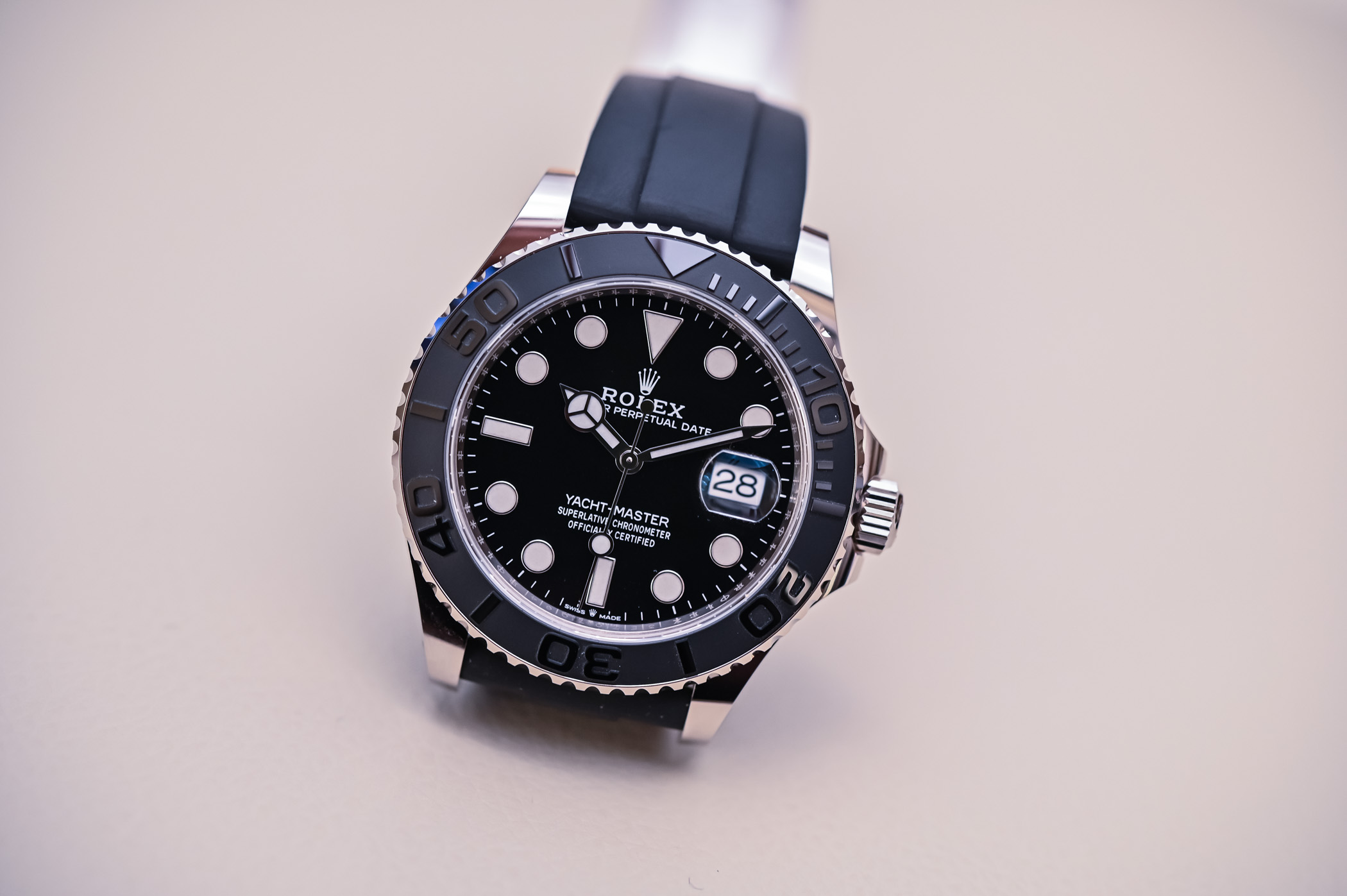 If for any reason your first glance at the watch led you to believe it was a Submariner, a quick look at the price tag will clearly establish its identity. This Yacht-Master 42 reference 226659, in white gold costs EUR 25,700 while the Submariner Date ref. 116610LN costs EUR 7,850: that’s a difference of EUR 17,850 (if ever you can find a Submariner Date at retail price… but that’s another debate)
