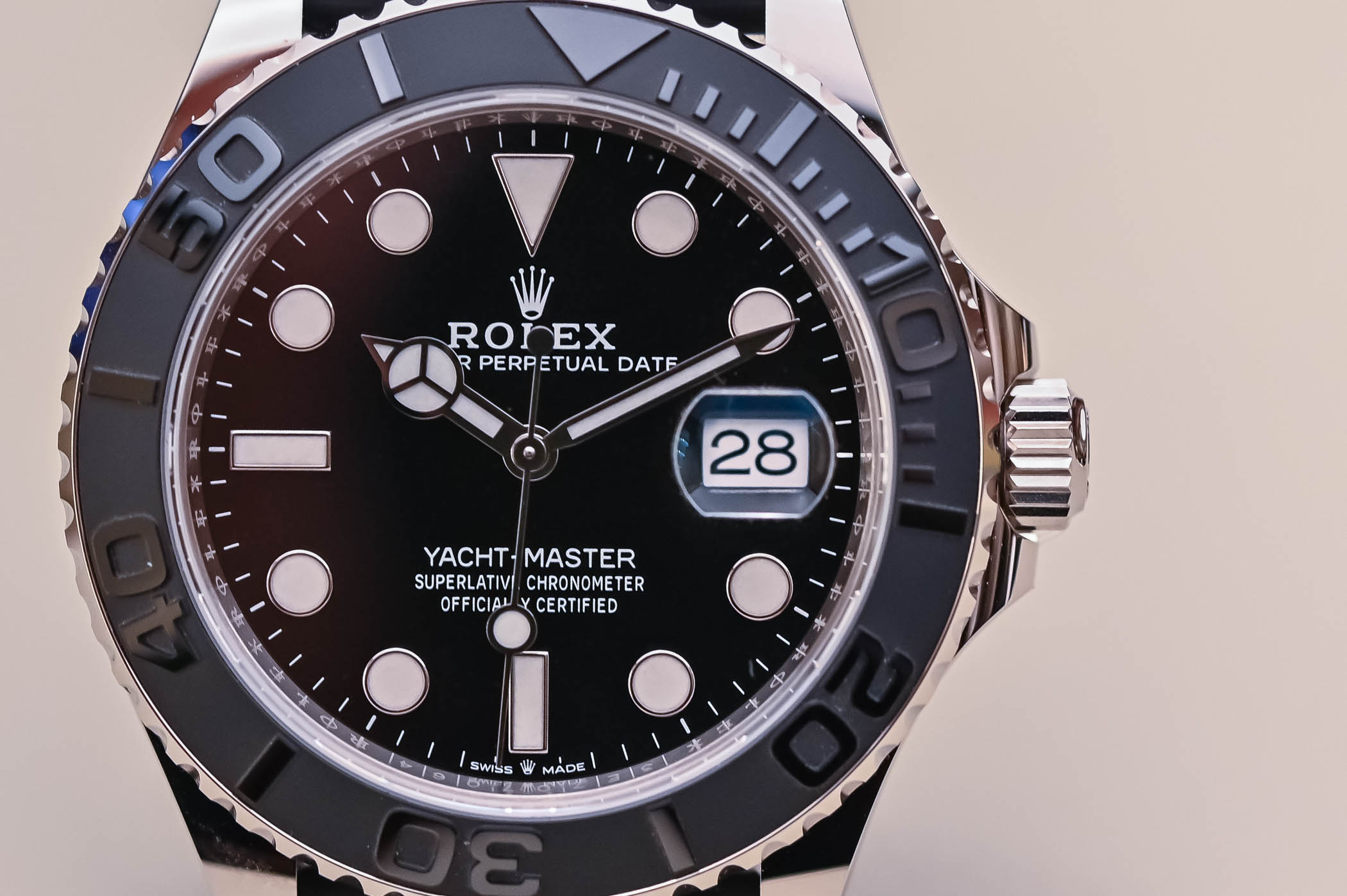 The distinctive white gold, bidirectional rotating bezel of this Rolex Yacht-Master 42 is filled with black Cerachrom ceramic. Developed and patented by Rolex, Cerachrom is a hard ceramic material that is practically scratch-proof, corrosion-resistant and impervious to ultraviolet rays. The matte black ceramic has been sandblasted to provide a more technical, contemporary finish and provides the background for the raised black numerals marking 0-60 minutes. The numerals and markers are first moulded into the ceramic and then polished to contrast with the sandblasted bezel.