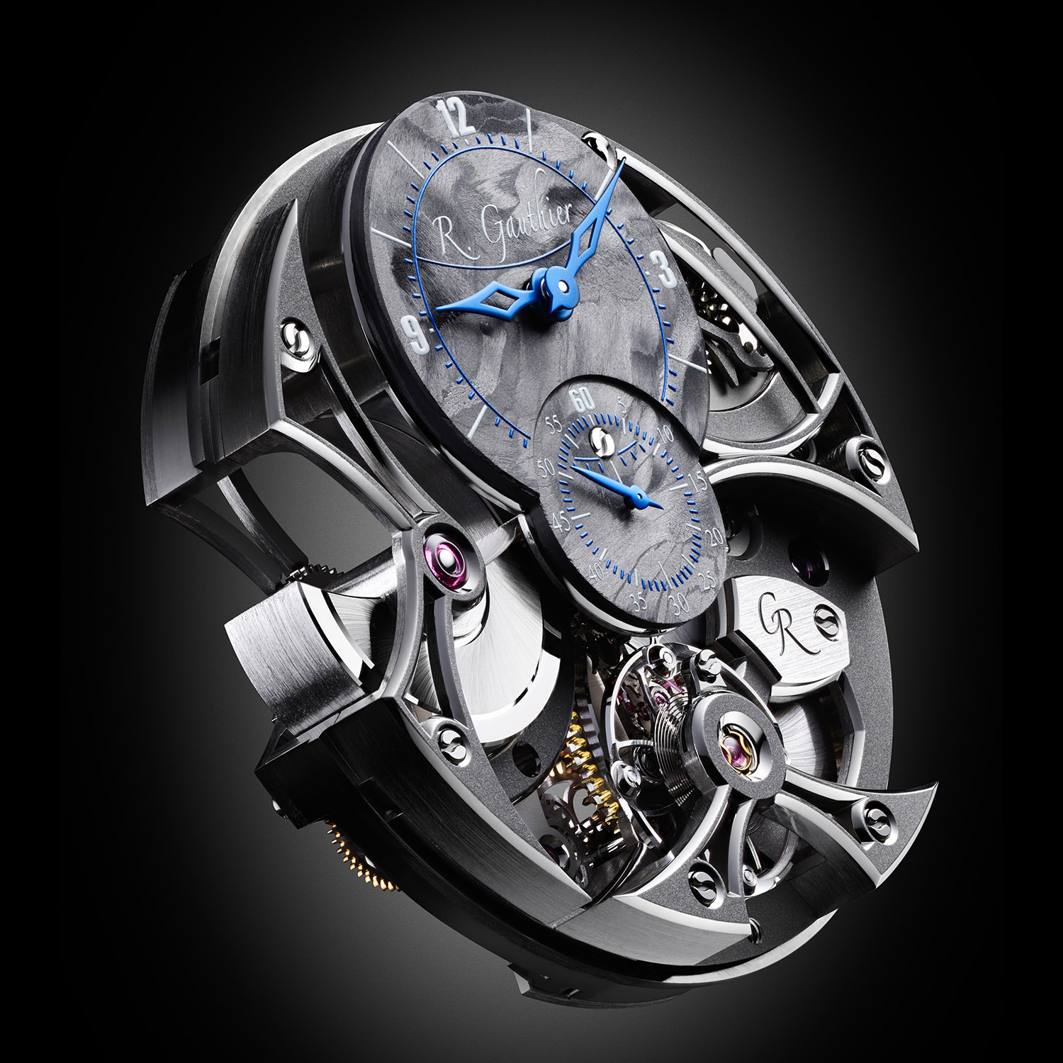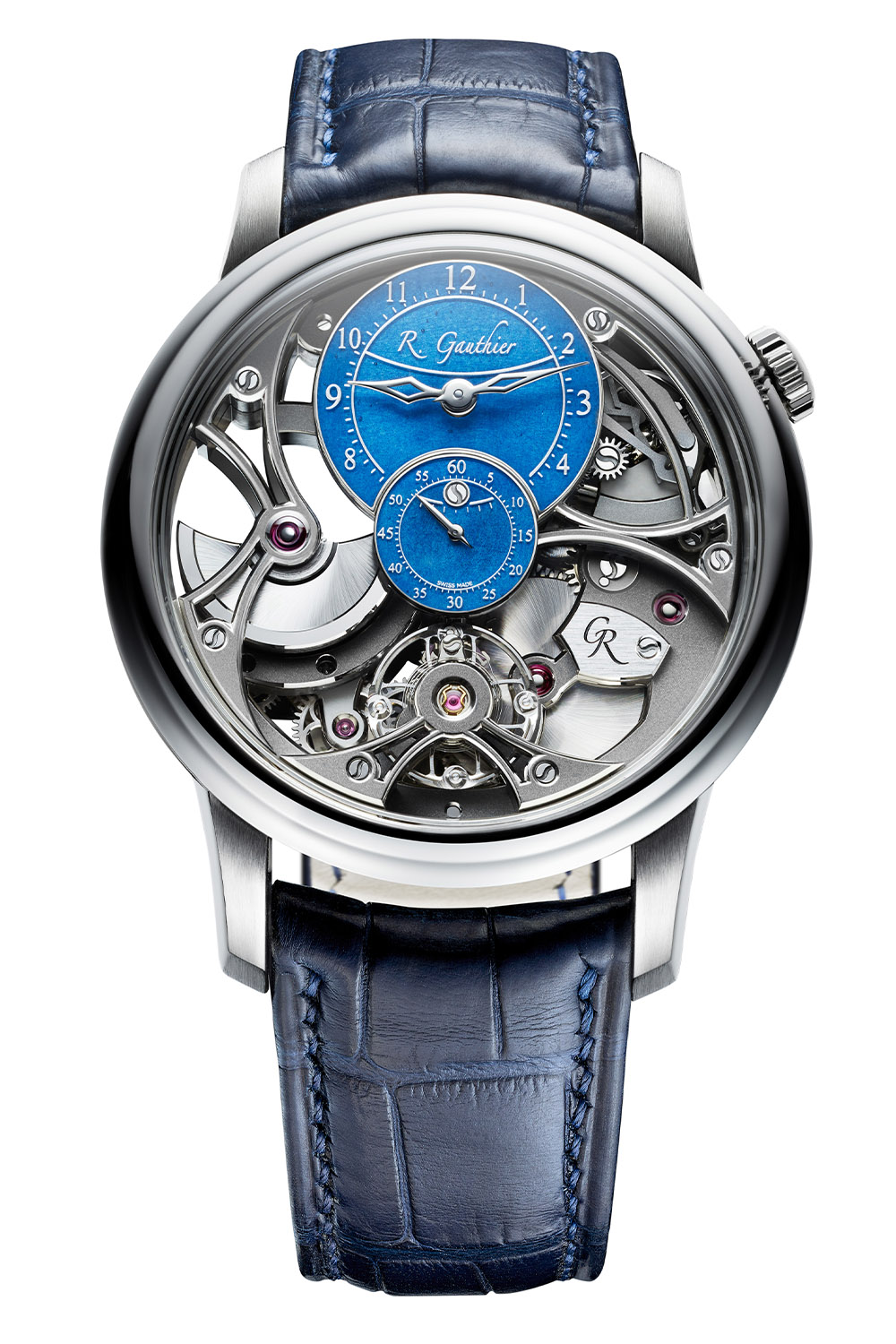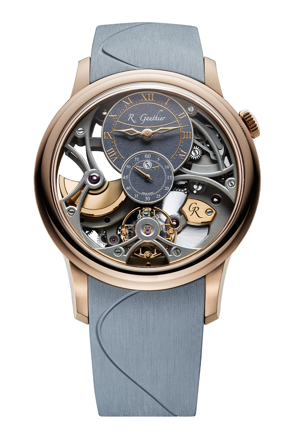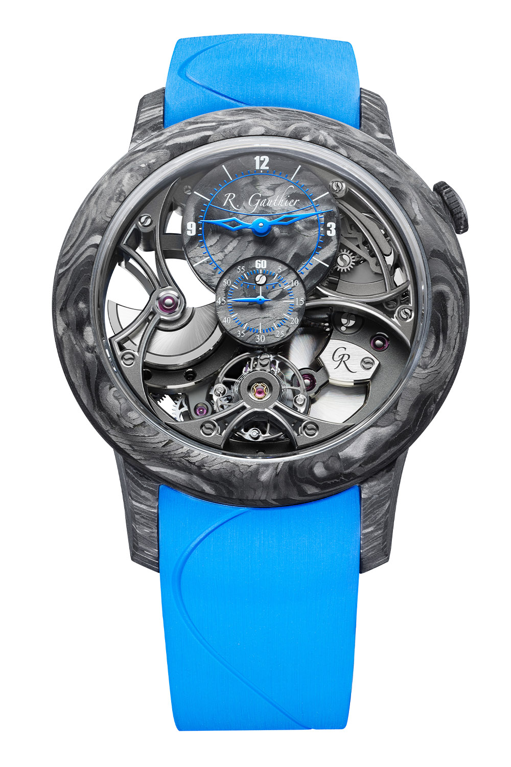 Even more special is the Manufacture-Only Carbonium® Edition, which can be purchased exclusively through Manufacture Romain Gauthier. This version has a larger case of 42mm made of Carbonium, a high-tech, high-performance carbon fibre composite invented and produced by French company Lavoisier Composites. Presented here with a matching carbon dial and bright blue accents, the timepiece can also be fully customized – finishing of the bridges and mainplate, colour of the steel hands, dial accents and plaquette engravings, and the colour of the natural rubber strap.