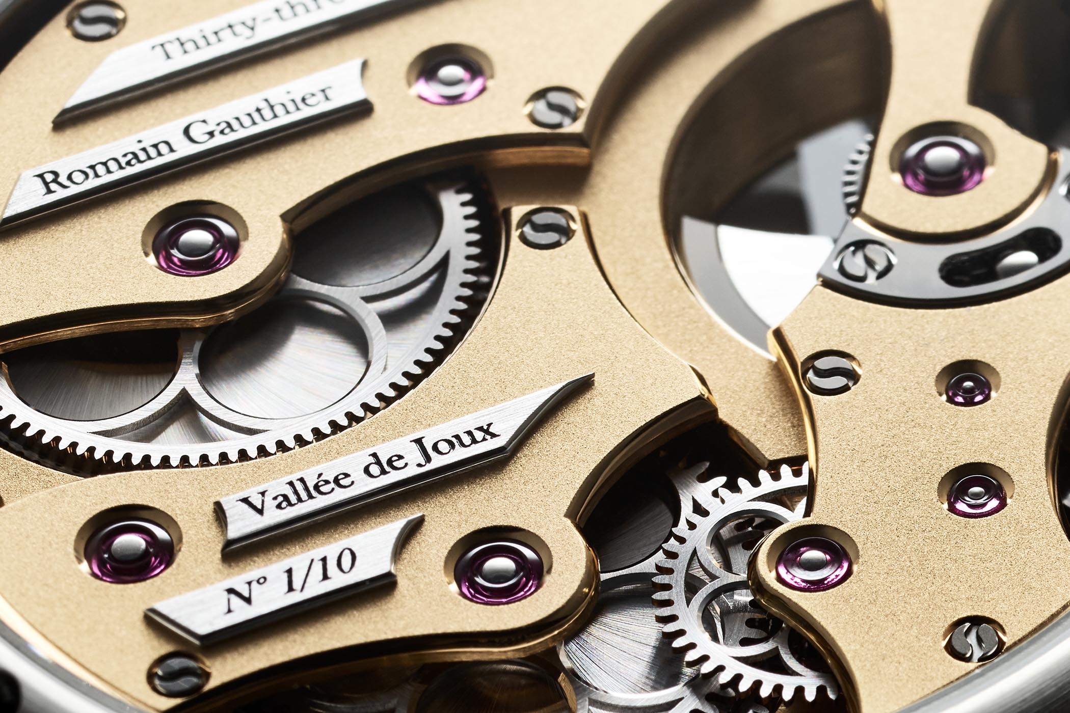 Turning the watch over, the bridges are hand-frosted and 4.5N gold plated – just like the mainplate. These contrast neatly with the rhodium-plated or white elements: the micro-rotor, plaquettes, gears, the barrel… Once again, the finishing is a feast for the eyes. For example, the anglage (with rounded profile), the hand-polished jewel countersinks, the polishing of the signature S-slot screw heads or the distinctive wheel with circular spokes are simply exceptional.