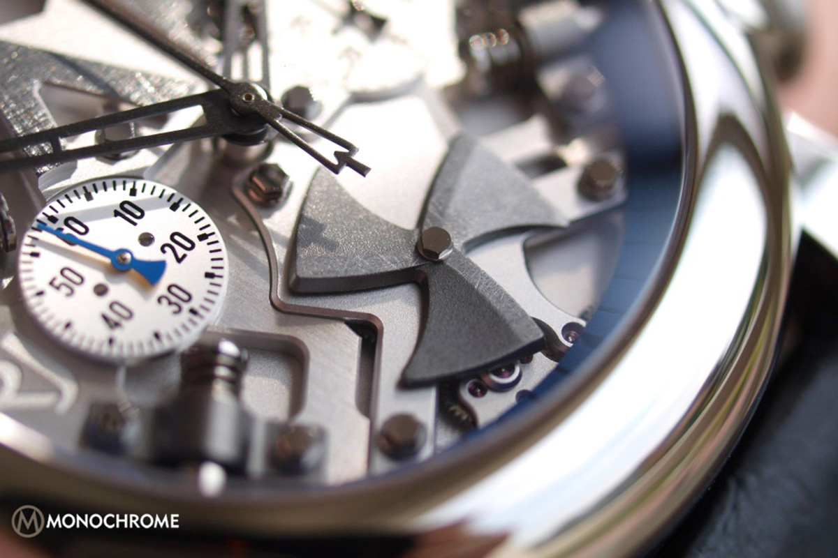 The seconds are registered by the centrally mounted hand, which is satin-brushed. The downside to this finishing is that the hand blends at bit too much into the other ruthenium coated parts that make up the dial.
