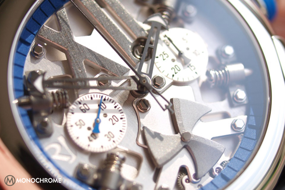 Apart from the sheer size of the case, there is a lot of detail to see on the dial of the Steampunk Chrono Blue. One of the first items that catch our attention is the fast spinning propeller at 6 o’clock. Our first guess would that this was the small seconds indication, but how wrong we were. It is just a gimmick! The propellor is coupled to the automatic winding rotor, and geared so that it moves four times faster than the movement’s rotor. This means that when the rotor turns, and therefore winds the main spring barrel, the propellor also spins around. When the rotor doesn’t turn, the propellers doesn’t turn either.
