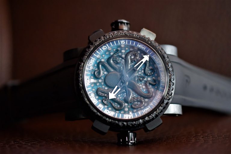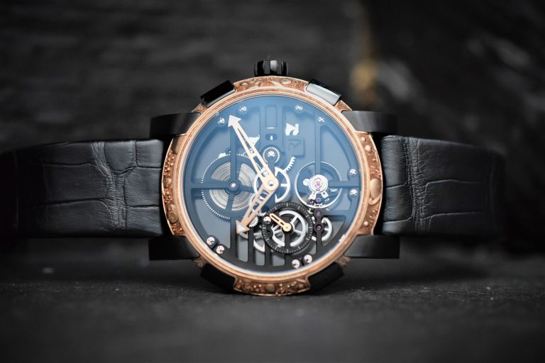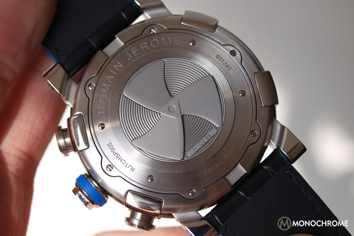The big “XII”, ruthenium coated, is a true Romain Jerome trademark. The same goes for the four distinct clamps surrounding the outside of the case, attached to the four pistons surrounding the dial. The anchor-styled hands and central seconds-counter are also ruthenium coated to complete the theme. The subdial at 9 displays the continuous running seconds with a blue hand. The subdial at 3 has a steel hand displaying the 30-minute chronograph counter. Furthermore, the RJ-logo is engraved at 9, directly onto the baseplate.