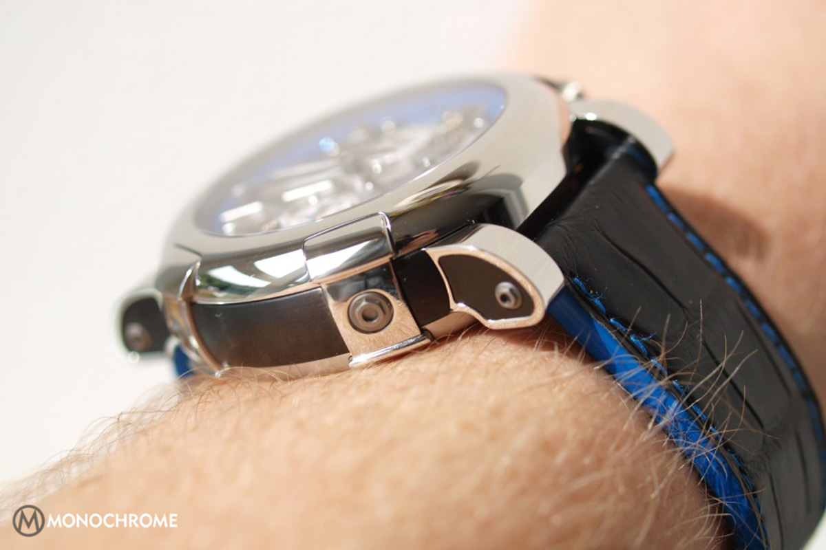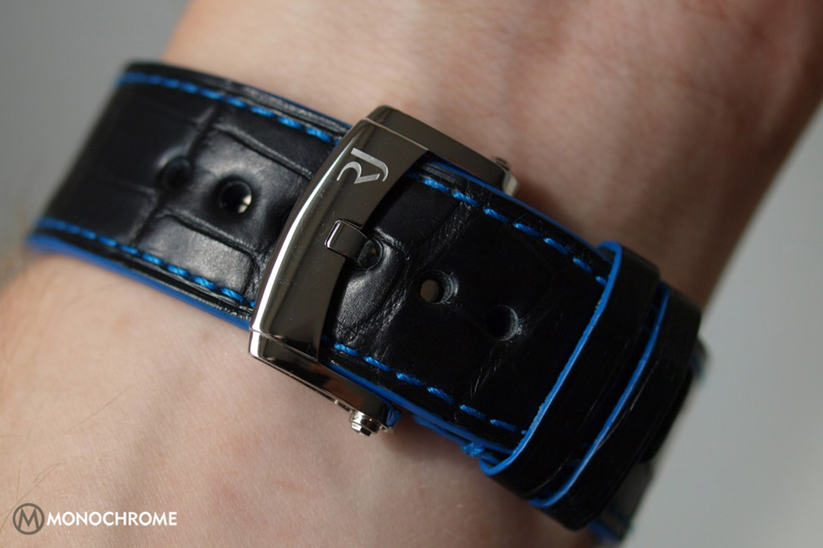 A blue lacquered ring on the perimeter of the case, almost rubber-like looking, has hours and minute markers notched into it. The dial also shows quite a bit of nuts and bolts, giving it a very industrial and nautical look, with a hint of blue (or one of the other colours for that matter). More blue is found on the rubber ring around the crown, the coloured sides and stitching of the black alligator strap.