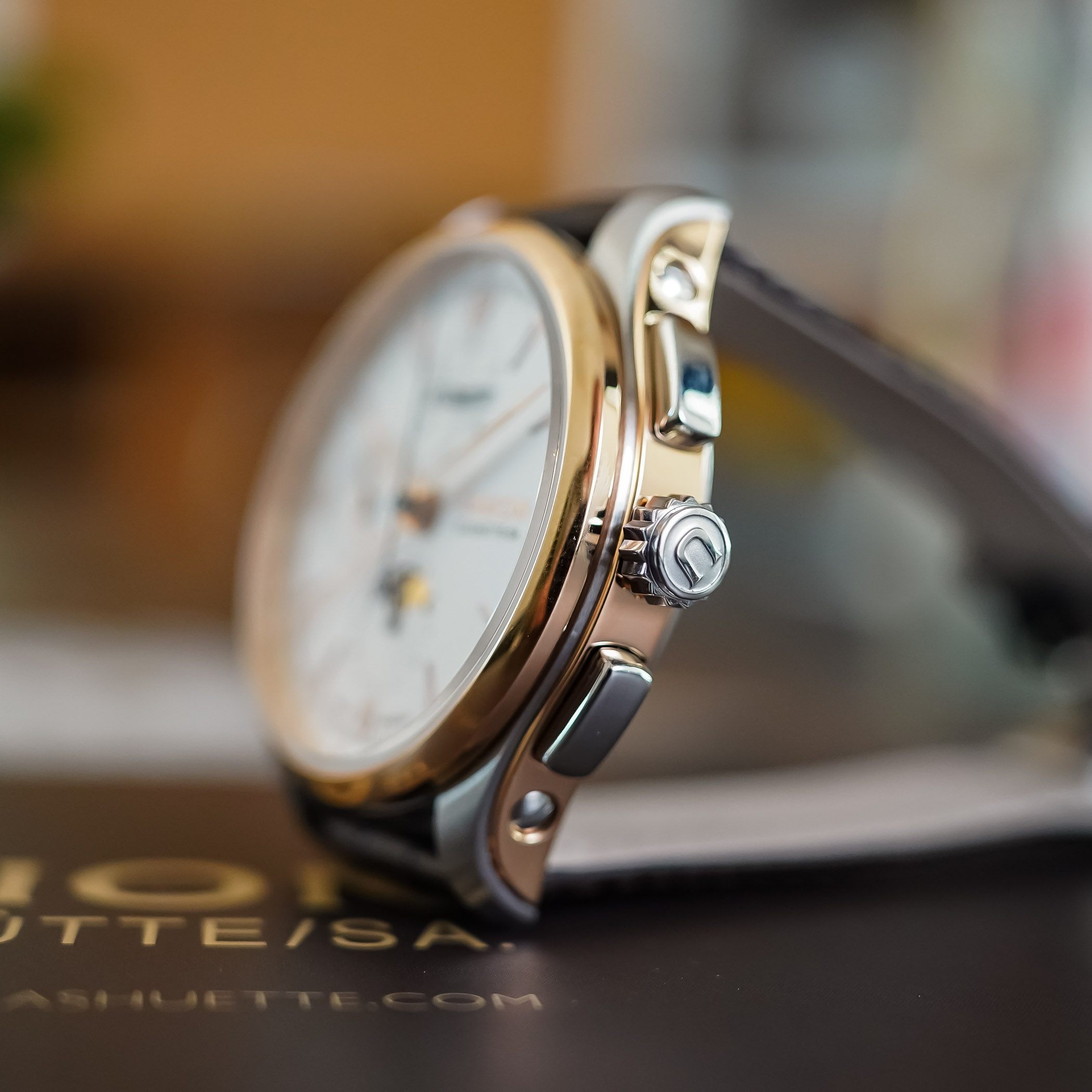 German entrepreneur Johannes Dürrstein opened a manufacture in Glashütte in 1893 to produce quality Glashütte watches at significantly lower prices than other manufacturers in town. Closed in 1933 and acquired by Swatch Group in 2000, Union Glashütte is proud of its Saxon watchmaking heritage and sticks to the founder’s policy of competitive prices. One of the best-represented categories at UG is the chronograph, appearing across all the brand’s collections (except women’s watches) with markedly different characters. The Belisar family has an eclectic lineup of retro and contemporary chronographs and dive watches. It is also home to a complicated and very complete reference, the Belisar Chronograph Moon Phase, returning in a handsome two-tone rose gold and steel case.