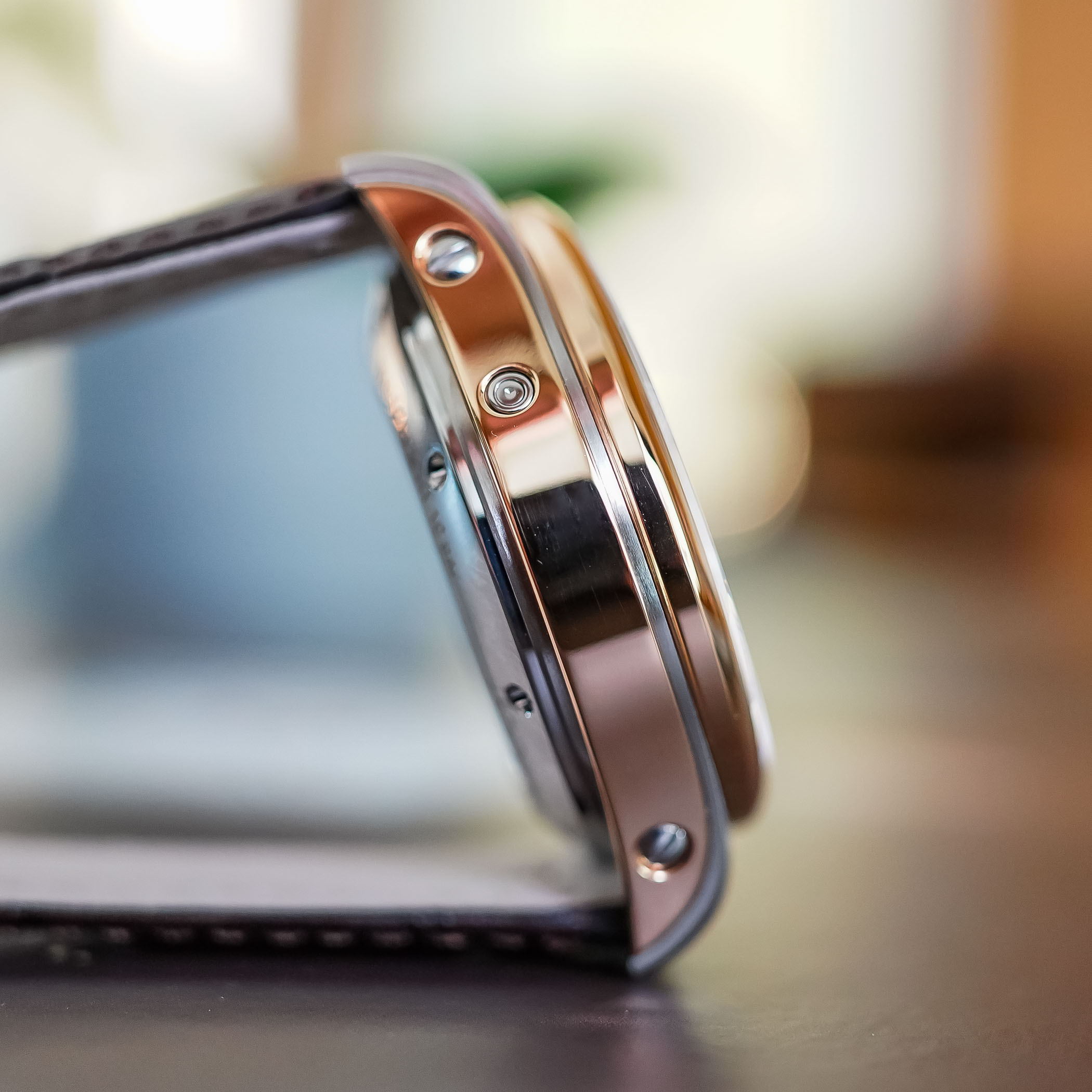 The new edition ups the luxury factor with its rose gold bezel and rose gold screwed flanks. Brightly polished, the bezel and flanks stand out against the satin-brushed surface of the lugs. Viewed in profile, the gold screwed flanks surround the rounded steel pushers, fluted crown and screws. Viewed from above, the gold flanks peek out from under the steel lugs to create an attractive stepped border.