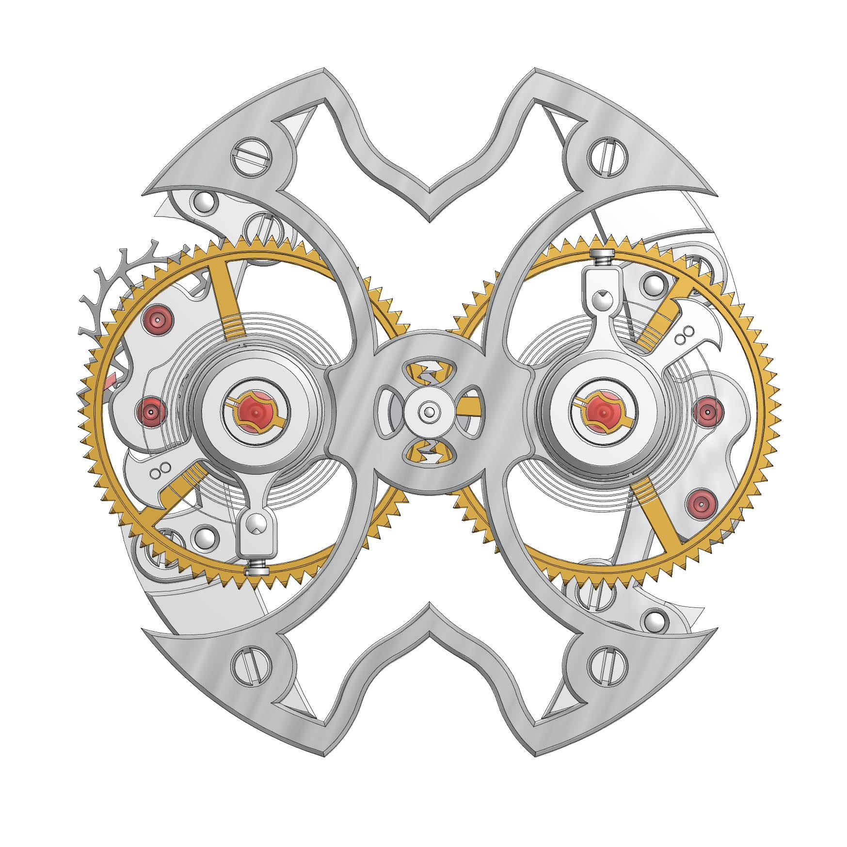 The construction is fairly complex. The Harmonious Oscillator is not a double tourbillon, where you usually have two independent regulators connected by a differential, which averages the rates. The Harmonious Oscillator is not a double regulator working on the concept of resonance – such as F.P. Journe with its Chronomètre à Résonance using the concept of resonance through a small volume of air, or Armin Strom with the Mirrored Force Resonance where the two oscillators are connected by a steel resonance clutch spring. Here, the balances are mechanically interlinked, and if there are two oscillators, there’s only one escapement. The Harmonious Oscillator is fairly unique in its architecture.