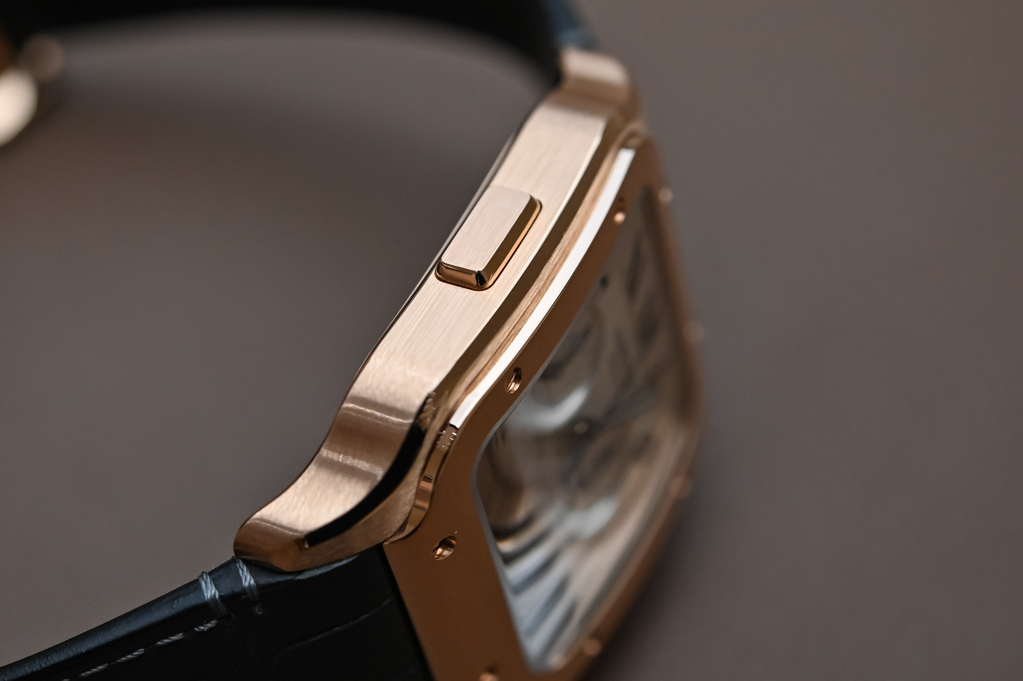 The first impression has to do with the size of the Santos de Cartier Chronograph, currently the biggest brother in the line-up of Santos watches. Touted as an ‘Extra Large’, the case measures 43.3mm x 51.4mm with a thickness of 12.5mm, but the gently curved lugs and integrated bracelet/strap attenuate its corpulence. The revisited case shape of 2018, with its softly rounded edges, sleek satin-brushed case and polished bezel and screws, conveys an immediate sense of luxury and you can feel the reassuring weight of the pink gold. Cartier has a unique ability to create interesting case shapes (see here for the latest revamping of the 1906 Tonneau watch), and even a ‘square’ watch like the Santos comes alive with movement and contrasting surfaces. I love the subtle wave shape on the right side of the case and the aperture it creates to embrace the crown and was impressed by the overall fluidity and sophisticated ergonomics of the case. Another big plus is the 100m water-resistance of the case.