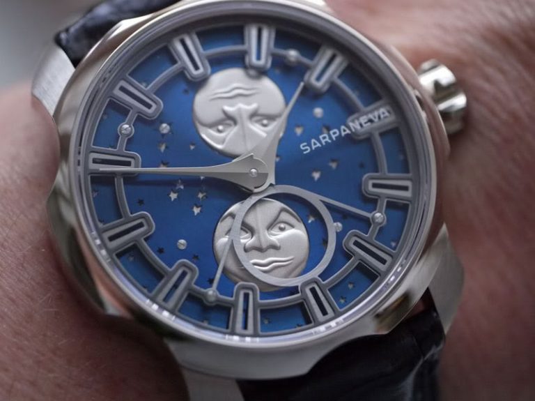 The Sarpaneva Korona’s are powered by the Soprod A10. The mainplate is modified by Sarpaneva to enhance the larger “skeleton” date disc feature for the Korona K1 and K2. The movement of these two models, visible through the caseback, has a rotor with white gold masses. Those skeleton dials are absolutely amazing! Because Sarpaneva reworked the movement’s mainplate he was able to keep the case very thin, less than 10mm. Especially for a 44mm large watch, featuring a moonphase, this is very special and makes the watch much more comfortable to wear!