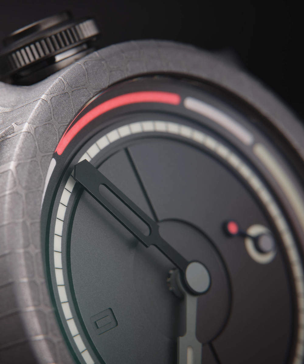 The dial base is dark grey with a fine matte texture divided into different segments at different heights. The central ring is cut in half, and the hands emerge from the recessed area. The sage green hour hand is lumed while the black minutes hand is openworked; when the hands meet at noon (represented by a 0), the minutes hand reveals the lumed area of the hours hand. The small seconds sub-dial at 6 o’clock, picked out in white, red and blue, sweeps beyond its boundary and glides over the two peripheral scales.