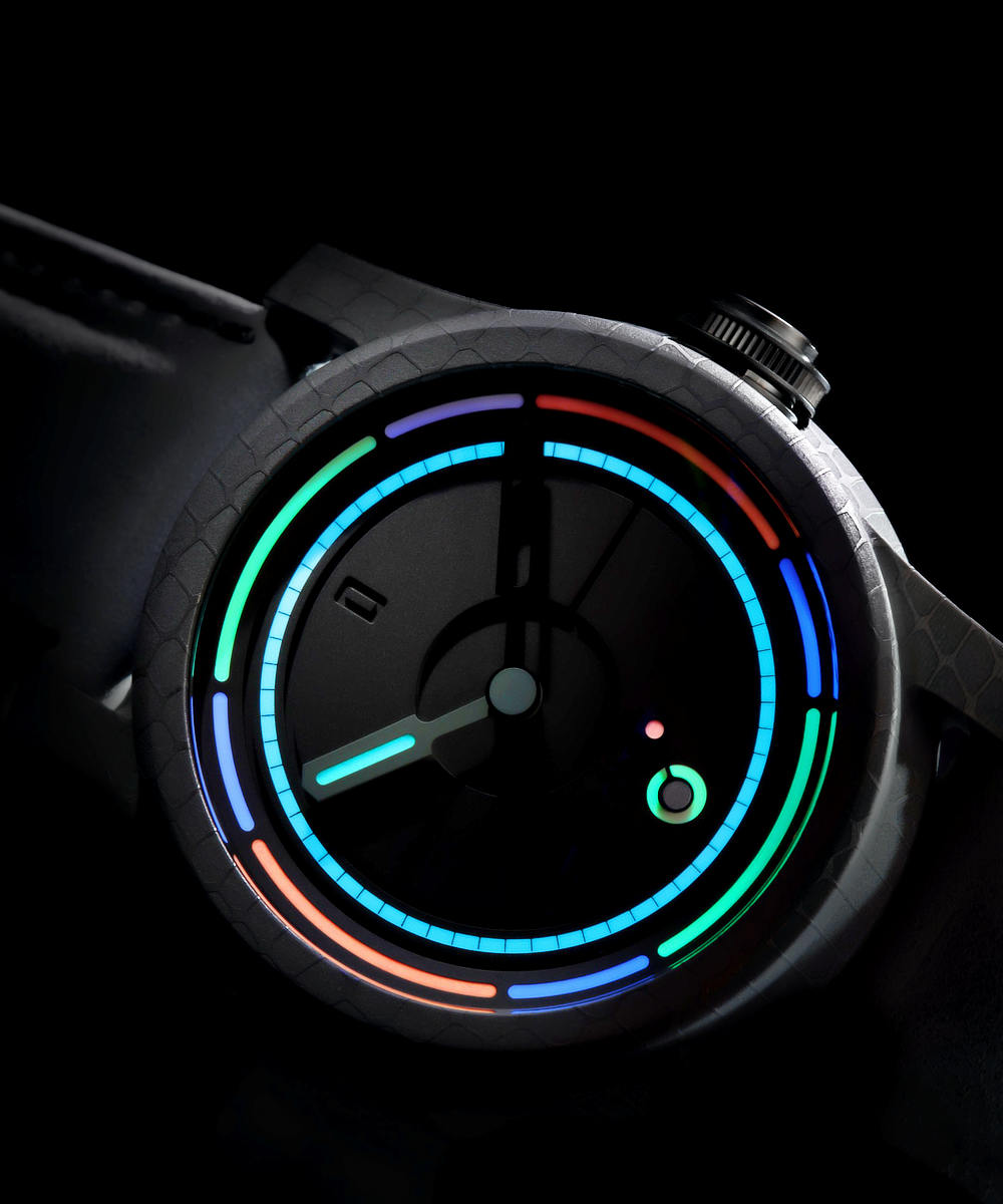 Minimalist yet wildly colourful in the dark, the multi-levelled dial features machined grooves filled with coloured luminescent material with different emissions. Having worked with Black Badger, Schofield likes to play with luminescence to create a more austere face during the day and a “laser show at night”, thanks to Super-LumiNova C3 touches in pink/red with green, blue, purple and orange emissions.