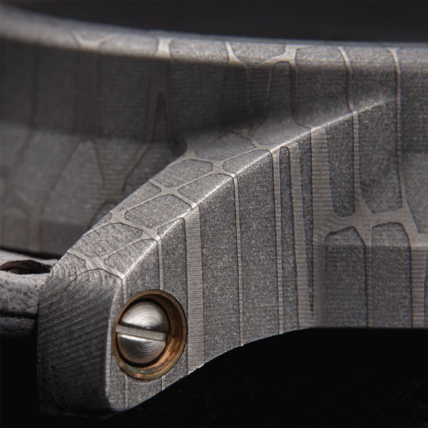 The Obscura case, measuring 44mm across and 15 mm thick, is made from Damascus steel with an unusual surface finish. The robust 200m water-resistant Schofield case, with its wide base, recessed case middle and short buttressing lugs, is machined and finished in Sussex. Combined with the acid etching treatment, the Damascus steel case reveals a strange textured grey two-tone surface akin to the scales of a reptile. The strap bar holes have bronze bushings contrasting with the steel strap bar screws. Another detail is the canister-shaped crown with its knurled grip and pink-lumed logo.