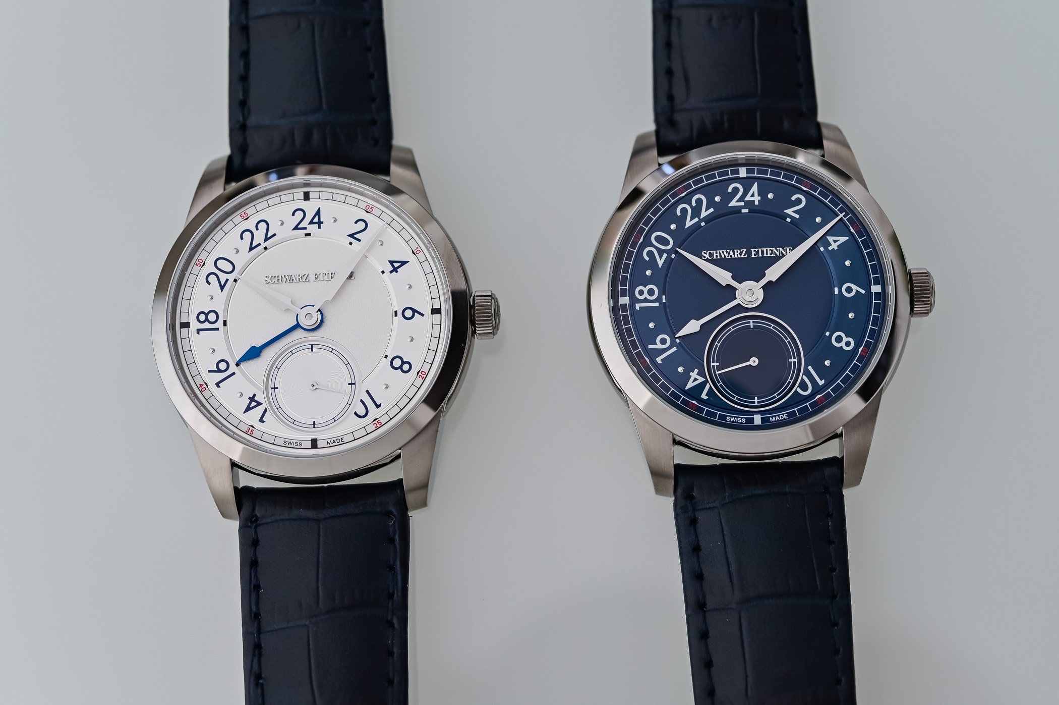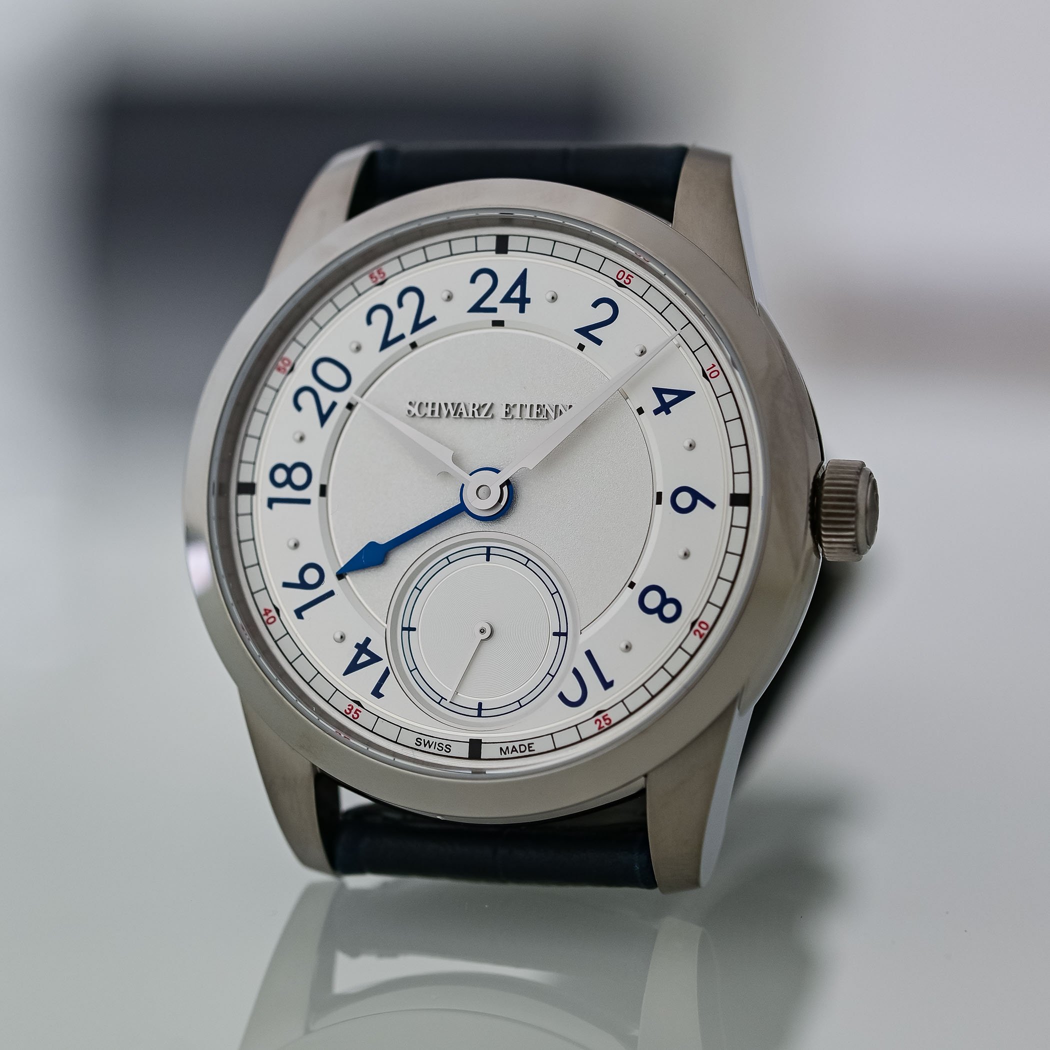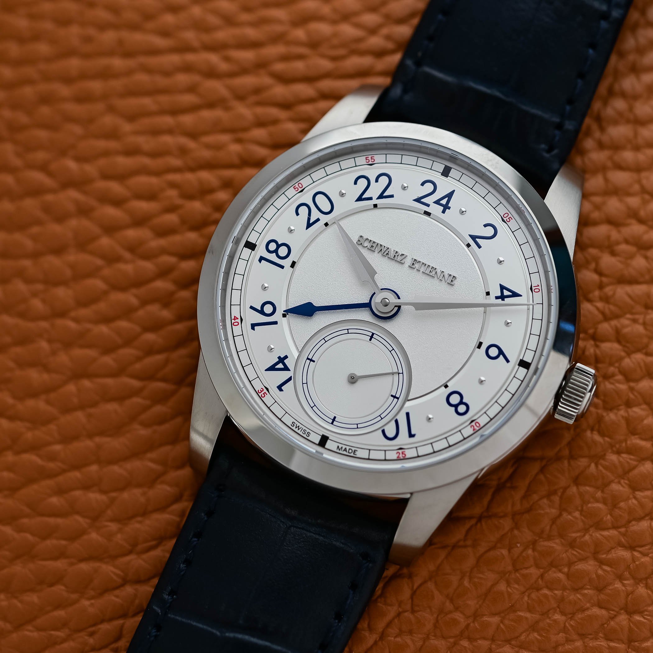 Schwarz Etienne offers the 1902 GMT in two straightforward, yet very nice finishes: a grained silver and a deep sunray blue. Both dials are multi-level: a textured central field contrasts with an opaline or circular-satin GMT hour ring and a recessed small seconds at 6 o’clock. Legibility is prioritised, lancine-style hour and minute hands with sandblasted and polished facets indicate local time while a prominent GMT hand (blue PVD on the silver dial, white-lacquered on the blue dial) points to the 24-hour ring. A narrow chemin de fer with red accents (double-digits to indicate 5-minute intervals) frames the dial and aids reading. The overall layout is restrained and engineered for clarity rather than ornament, which does not make the overall appearance any less interesting.