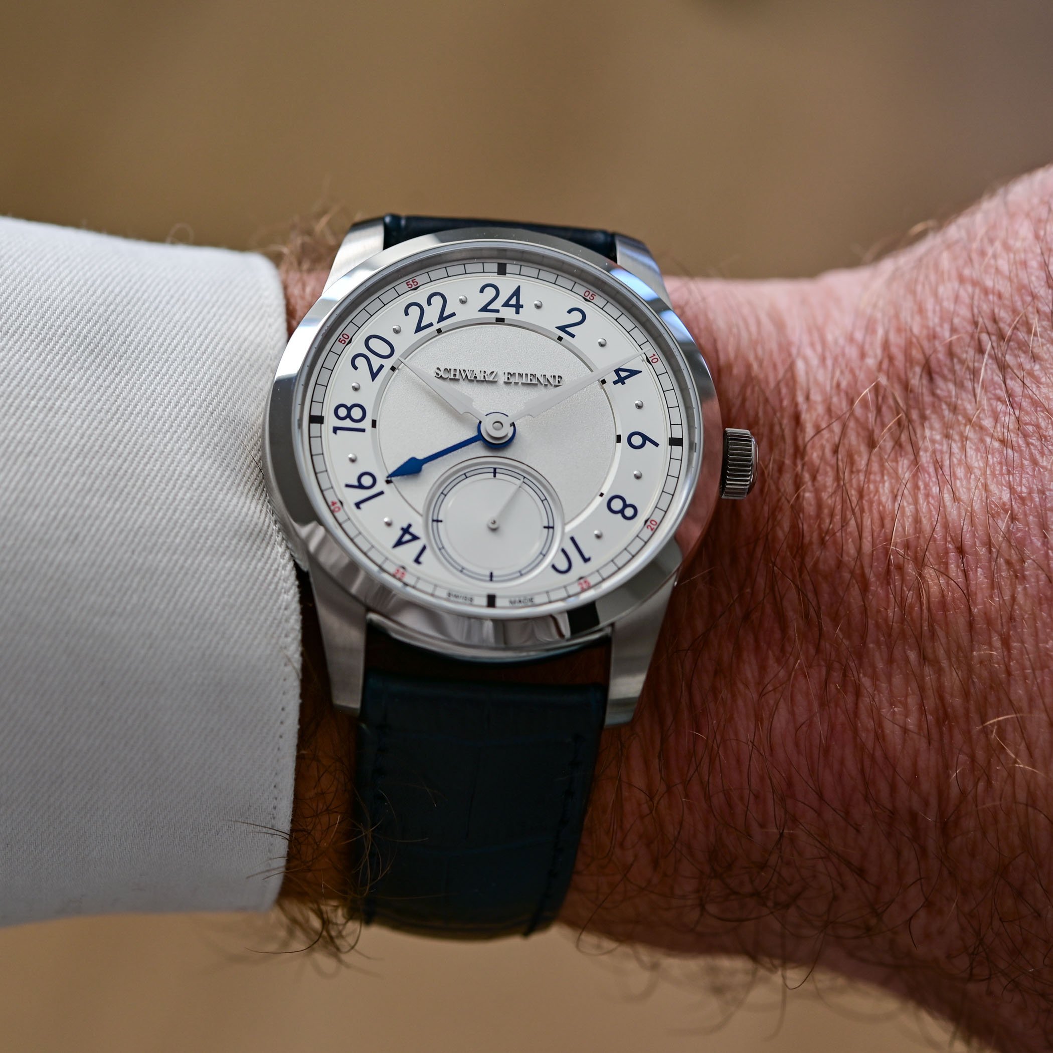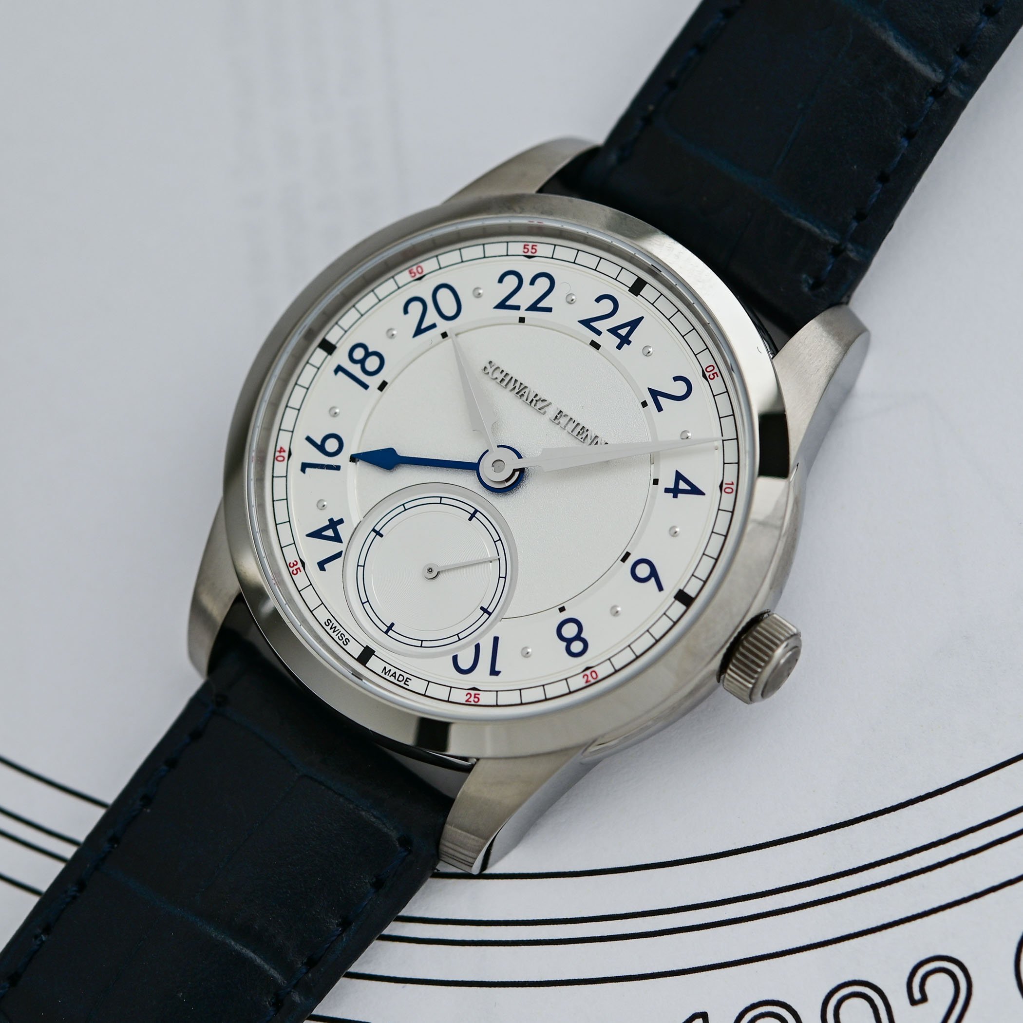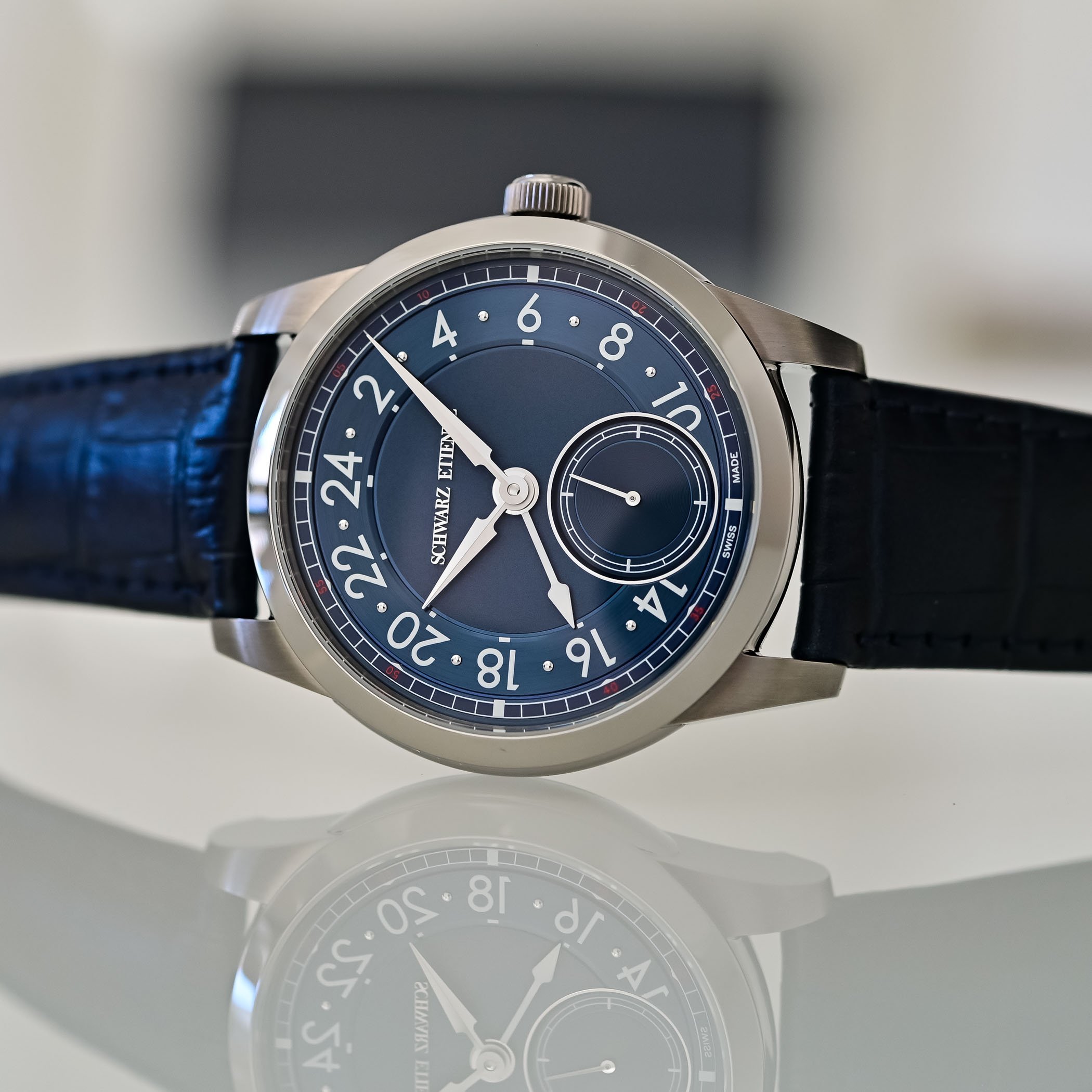 Schwarz Etienne offers the 1902 GMT in two straightforward, yet very nice finishes: a grained silver and a deep sunray blue. Both dials are multi-level: a textured central field contrasts with an opaline or circular-satin GMT hour ring and a recessed small seconds at 6 o’clock. Legibility is prioritised, lancine-style hour and minute hands with sandblasted and polished facets indicate local time while a prominent GMT hand (blue PVD on the silver dial, white-lacquered on the blue dial) points to the 24-hour ring. A narrow chemin de fer with red accents (double-digits to indicate 5-minute intervals) frames the dial and aids reading. The overall layout is restrained and engineered for clarity rather than ornament, which does not make the overall appearance any less interesting.