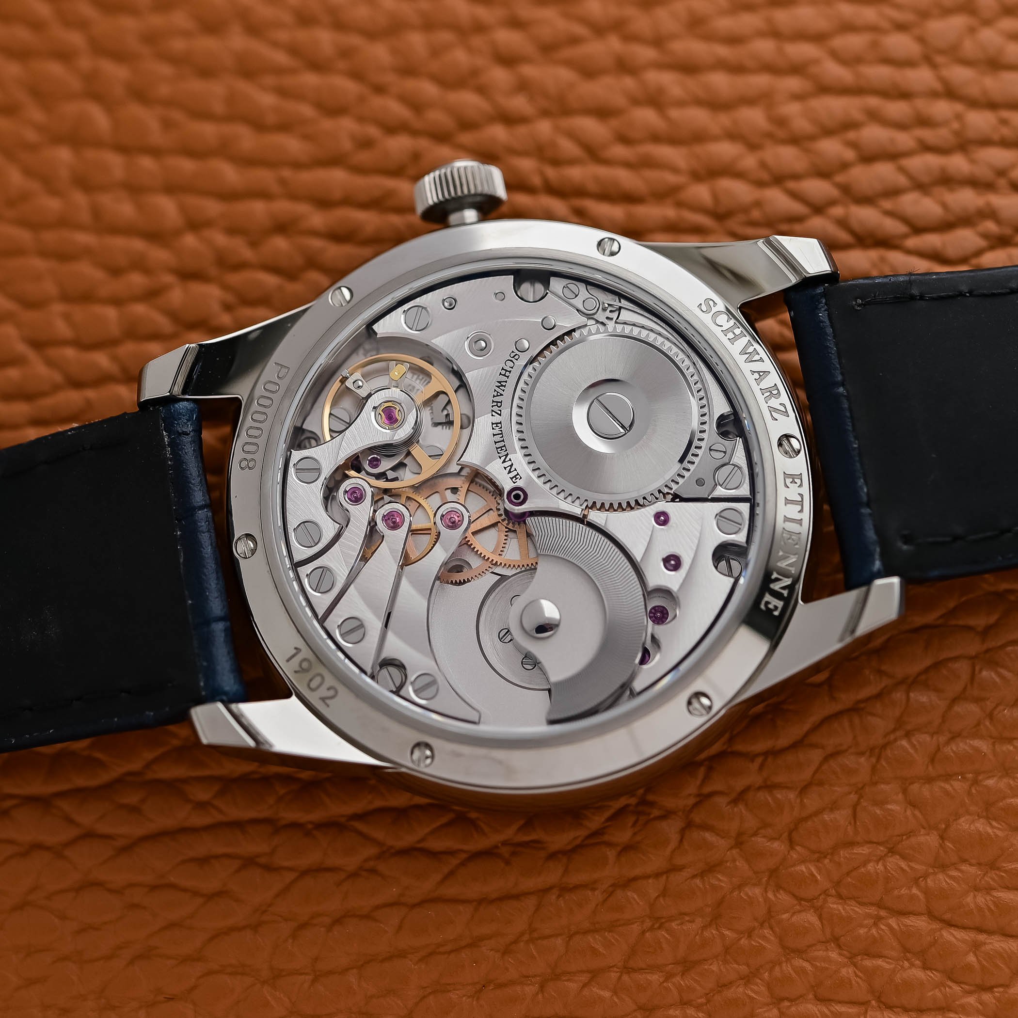 The new model is powered by Schwarz Etienne’s ASE 320.00 automatic, a micro-rotor calibre developed and assembled in-house. The bidirectional GMT hand is independently adjustable. The movement is compact, measuring 5.35 mm in height thanks to the micro-rotor, which sits flush with the adjacent bridges, and incorporates a newly developed in-house ball bearing to optimise winding efficiency. Finishing is purposeful: six bridges with polished inner angles and concave bevels, a sandblasted rhodium-plated mainplate, Côtes de Genève on selected bridges, and a chevron-patterned micro-rotor.