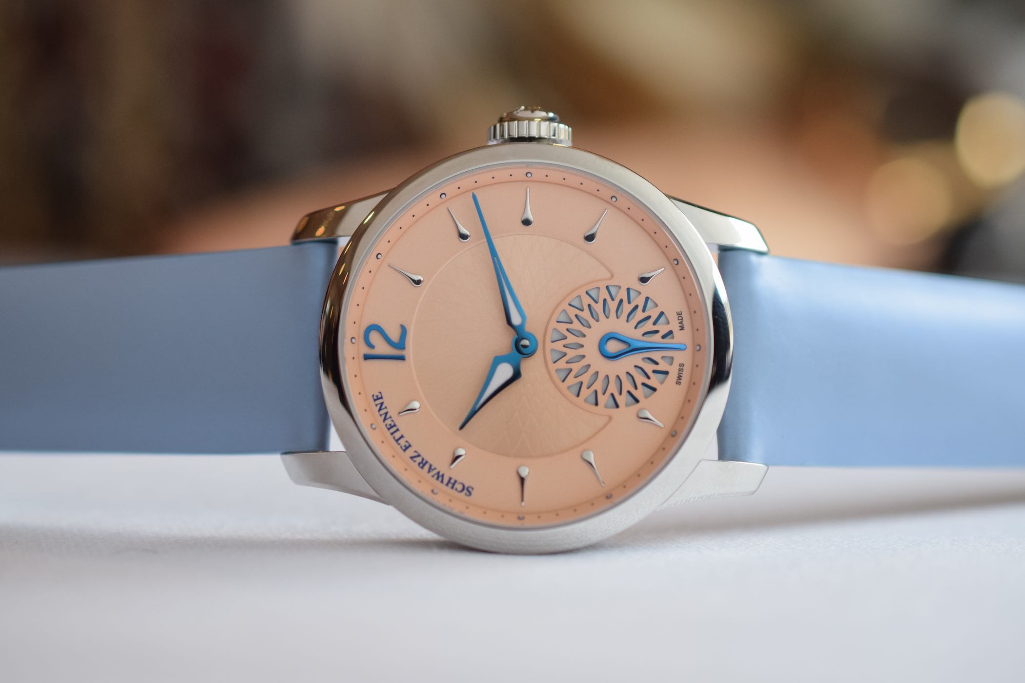 One of the surprising things about Schwarz Etienne is its high degree of technical competence. A niche brand capable of producing its own balance wheels and hairsprings is a rara avis. You can watch our video about our visit to Schwarz Etienne and its sister company E20 innovations where the hairsprings are manufactured, here. The Fiji Floral Seconds is fitted with an in-house automatic movement – calibre ASE 200.00 – with a micro-rotor.