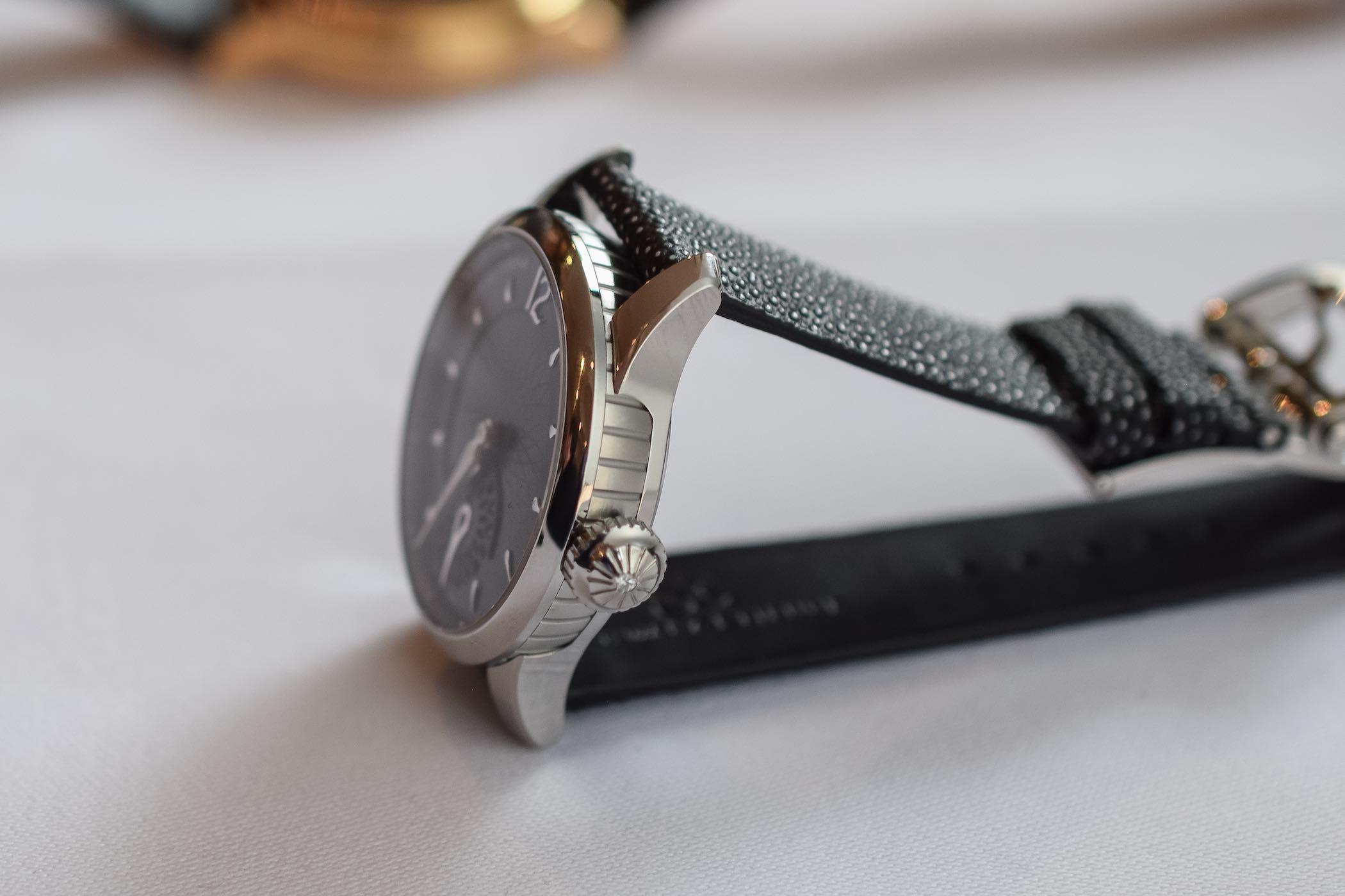 With a height of 10.76mm, the case has a lot of personality and presence and is a far cry from your traditional dainty women’s watch case. The modularity of the case, the fact that the central component can be extracted from the lugs and the bezel from the case, translates into greater choice for the customer in the future. Suppose you don’t like the shape of the lugs or prefer a smooth case with no engravings, or perhaps you fancy an engraving on the bezel? The modular approach to the case design opens up a world of possibilities.
