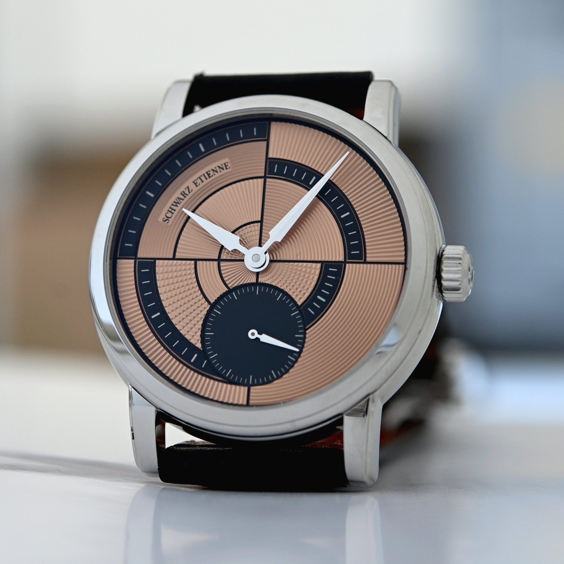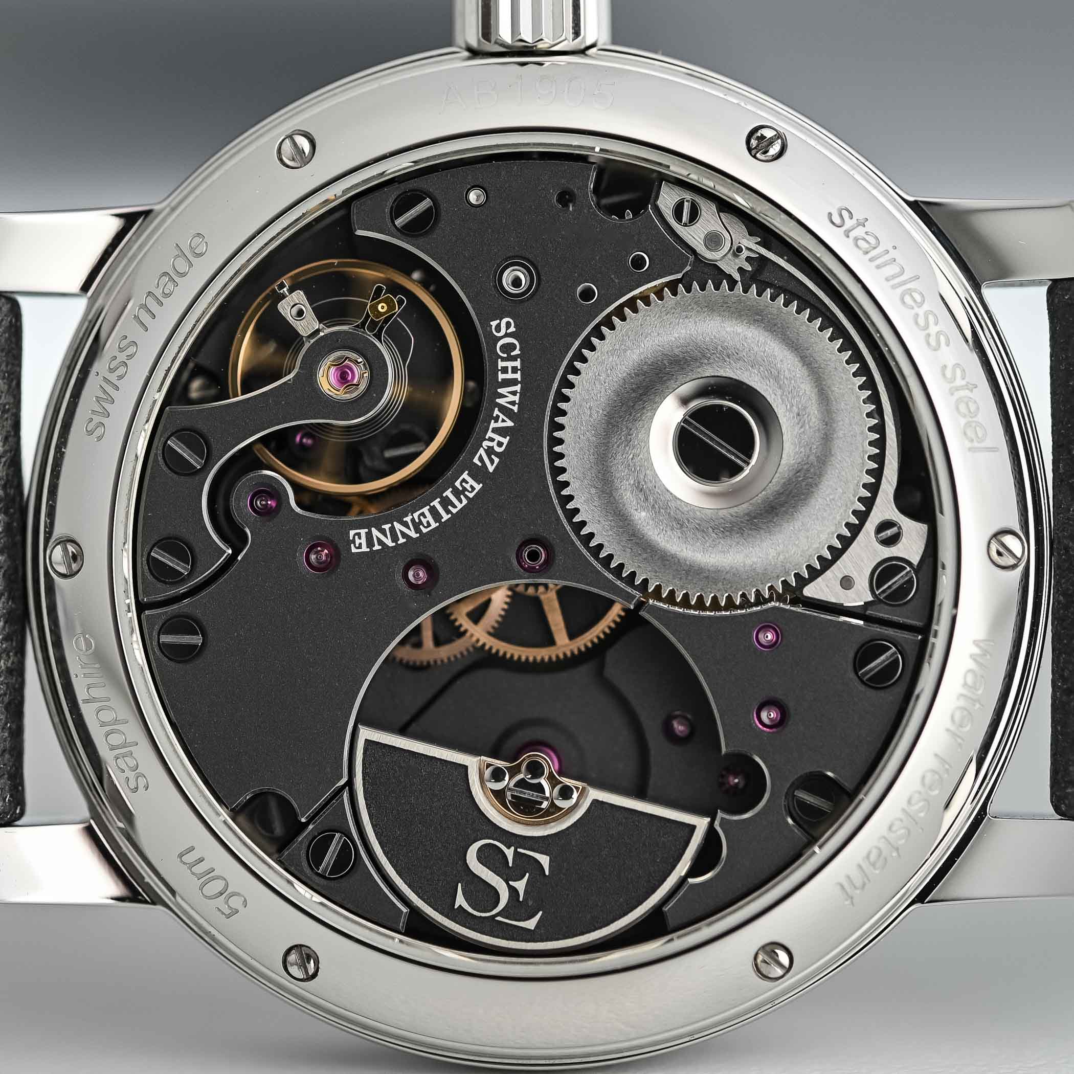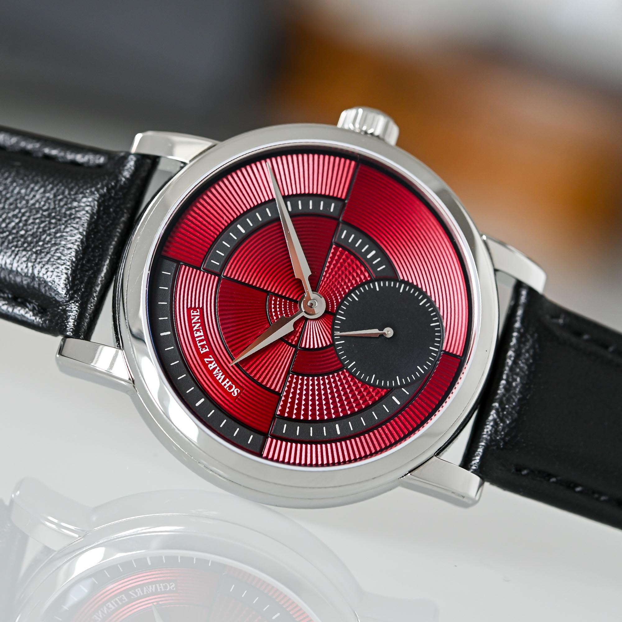 Next in line, again adding some pizzazz to the visual side, was the Schwarz Etienne Geometry, this time inviting designer Eric Giroud to transform the dial, and dialmaker Metalem to create a deconstructed hand-guilloché dial. First released in silver and salmon, followed by a bold cherry red edition, the Geometry comes back this year in a more traditional, monochromatic model with a black dial and some enhancements regarding the decoration of the movement.