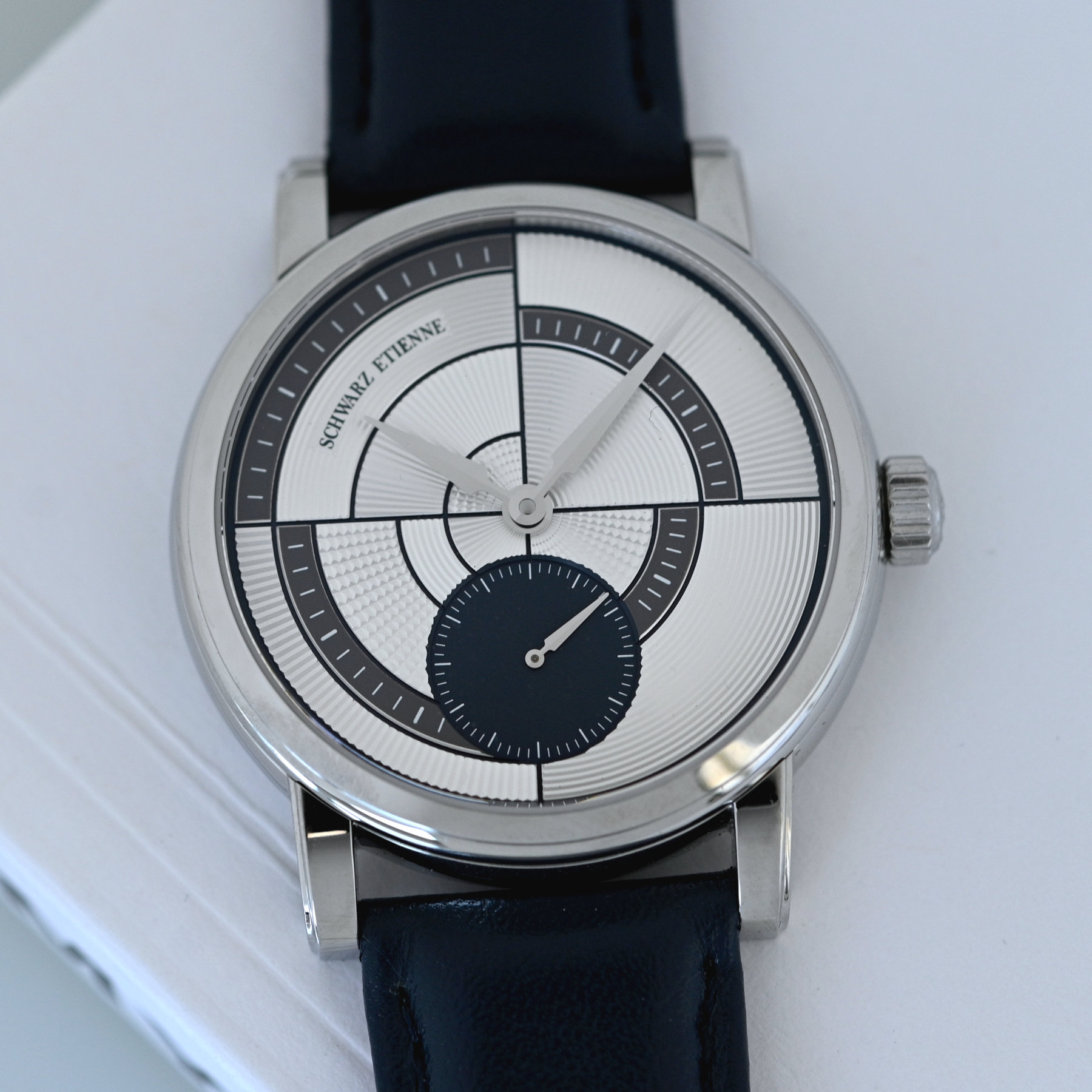 The dial is a joint creation between Schwarz Etienne, designer Giroud and dialmaker Metalem. Using a solid 18k gold base and classic hand-guilloché technique, the dial is geometrically split into four segments, each quadrant housing a series of concentric snailed arcs, fan-like pleats, Clous de Paris motifs and flat sandblasted areas. The medley of alternating patterns, with 3D ridges that rise and fall, produces a mesmerising, highly kinetic effect. Take, for example, the flat sandblasted minutes track with silver markers and follow its non-linear course across the four segments – or the Clous de Paris motif that only appears in three segments and the changing size and height of the guilloché patterns that add so much depth to the dial. It is a fantastically complex dial that, for whatever reason, is both playing with your mind and yet remains easy to read.