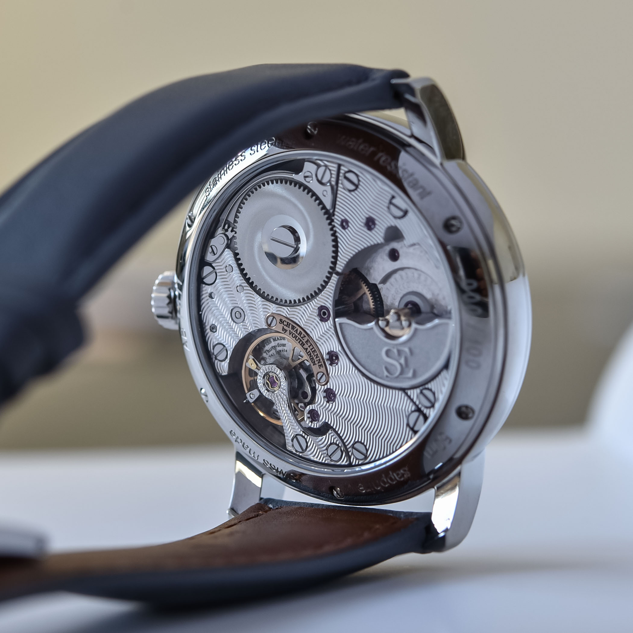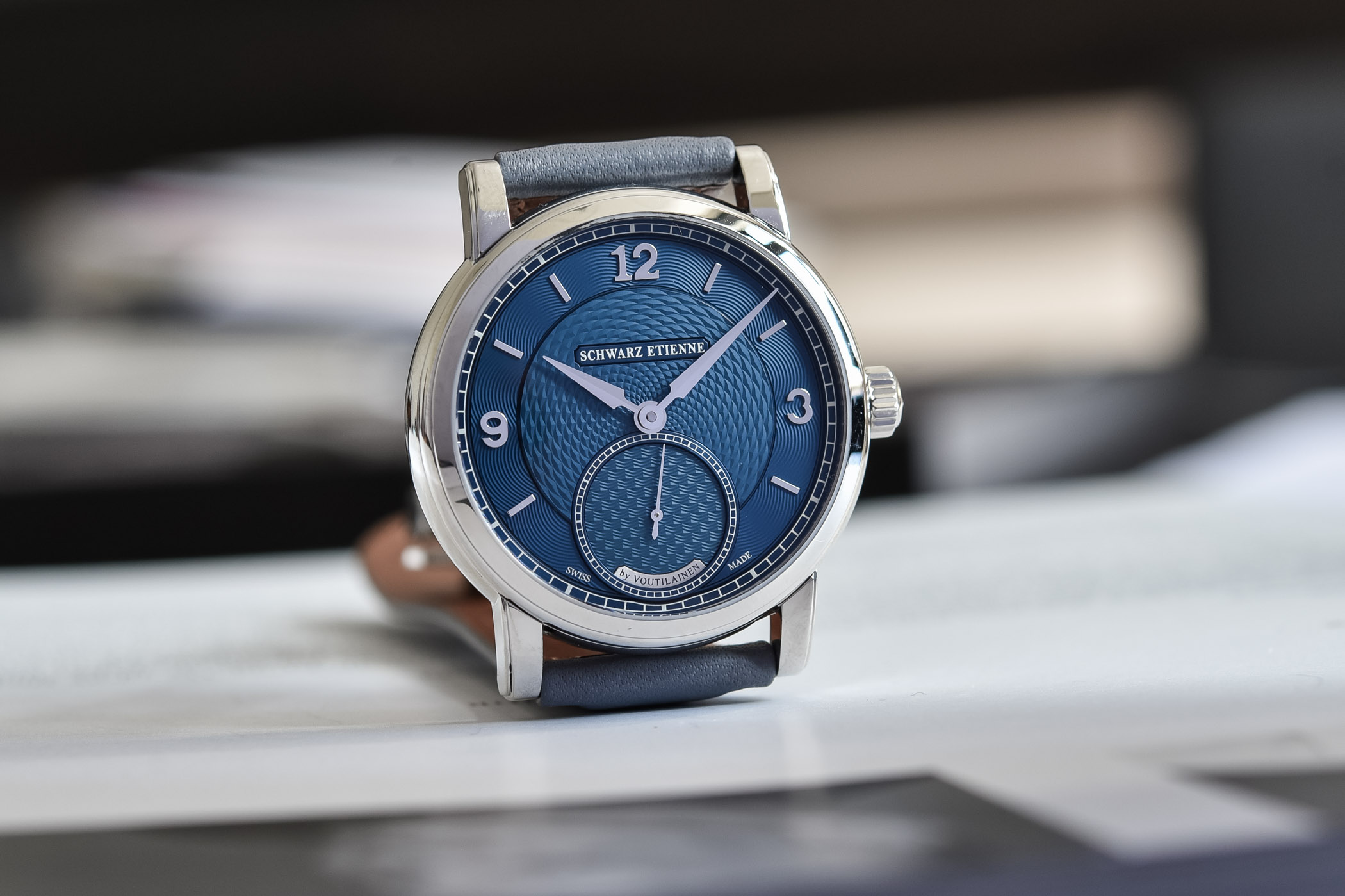 The superb engine-turned dial is one of the main attractions of the watch. It is offered in two colours, “ocean blue” and “sand grey”. Made from a solid silver plate, it stands out with different guilloché patterns creating an interesting sense of depth: guilloche soleil (sun) for the outer circular section, écaille de poisson (fish scale) for the centre part and vague (wave) for the generously proportioned small seconds sub-dial. The applied Arabic numerals and indexes are paired with faceted Alpha-type hours and minutes hands. Two applied cartouches bear the captions “Schwarz Etienne” and “by Voutilainen”.