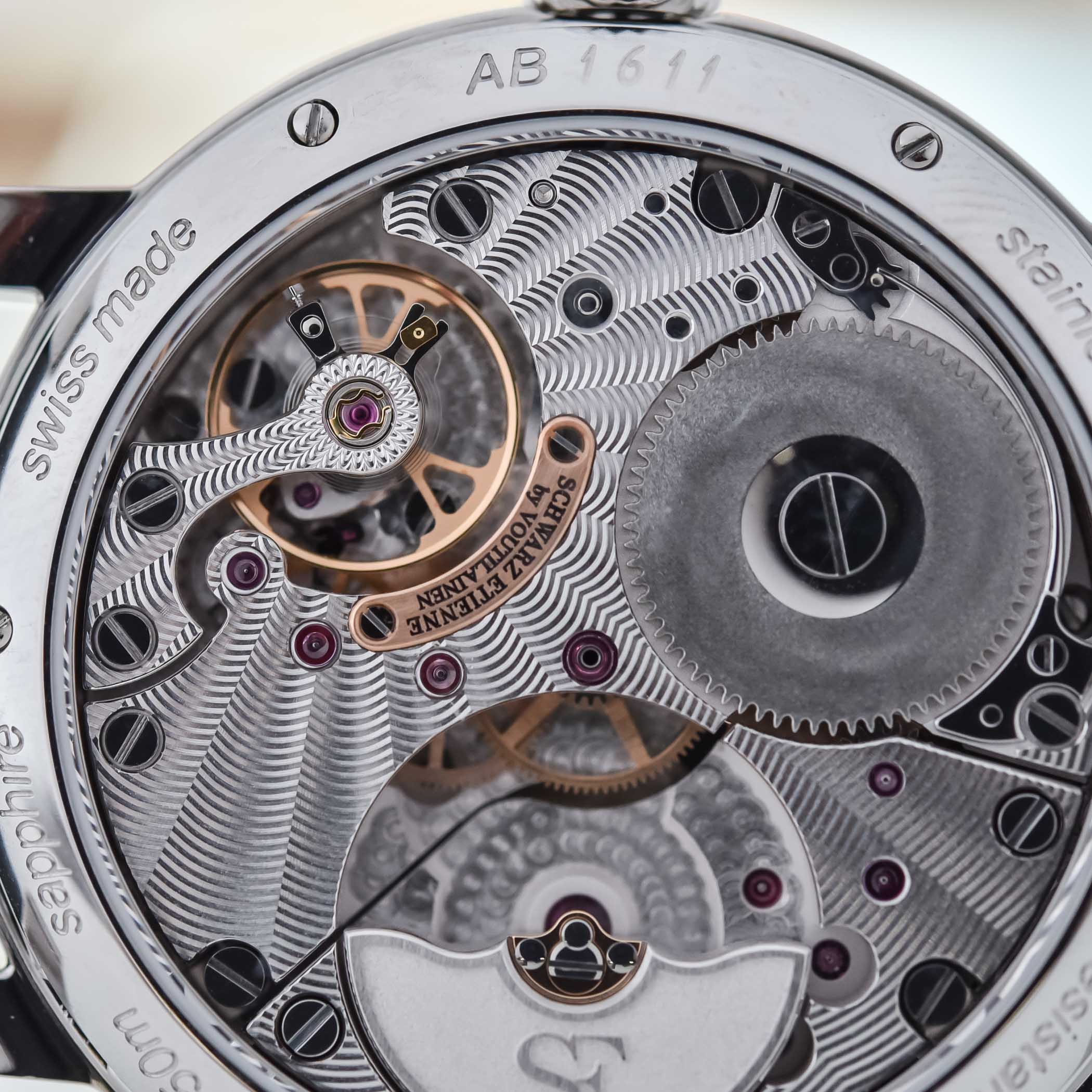 Flip the watch over and you are granted an unimpeded view of the automatic, in-house Calibre ASE 200.00, revealed behind a sapphire crystal. Decorated in collaboration with Kari Voutilainen, the Schwarz Etienne micro-rotor movement appears in a new light. The bridges are finely bevelled and adorned with a guilloche pattern radiating from the balance wheel. The ratchet features a characteristic Voutilainen finish. The jewel sinks and screws are polished and perlage is visible, adjacent to the micro-rotor. A red gold cartouche “Schwarz Etienne by Voutllainen” is applied at the periphery of the balance wheel. The Calibre ASE 200.00 runs at 21,600 vibrations/hour and boasts a power reserve of 86 hours when fully wound. The stop-seconds mechanism allows for precise time setting.