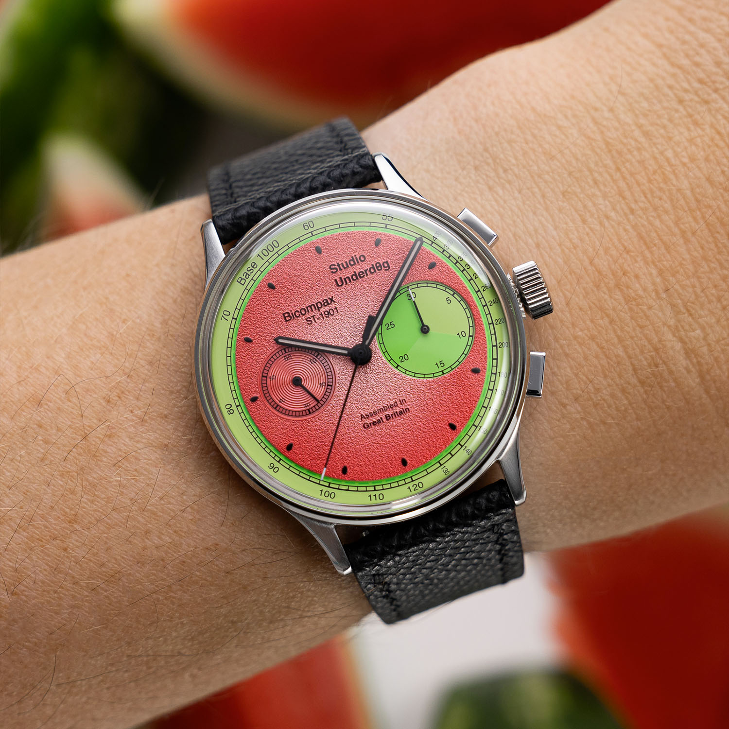 The Studio Underd0g 01SERIES 3rd-Generation comes with a slightly reworked dial too, available in 4 bold and fresh colours – Watermel0n, Desert Sky, Go0fy Panda and Mint Ch0c Chip – still with varied sizes of the sub-dials and coarse-grained-like texture, framed by a tachymeter scale. All are worn on a supple Epsom Calfskin strap. Overall, minimal changes compared to the Gen-1 and Gen-2.