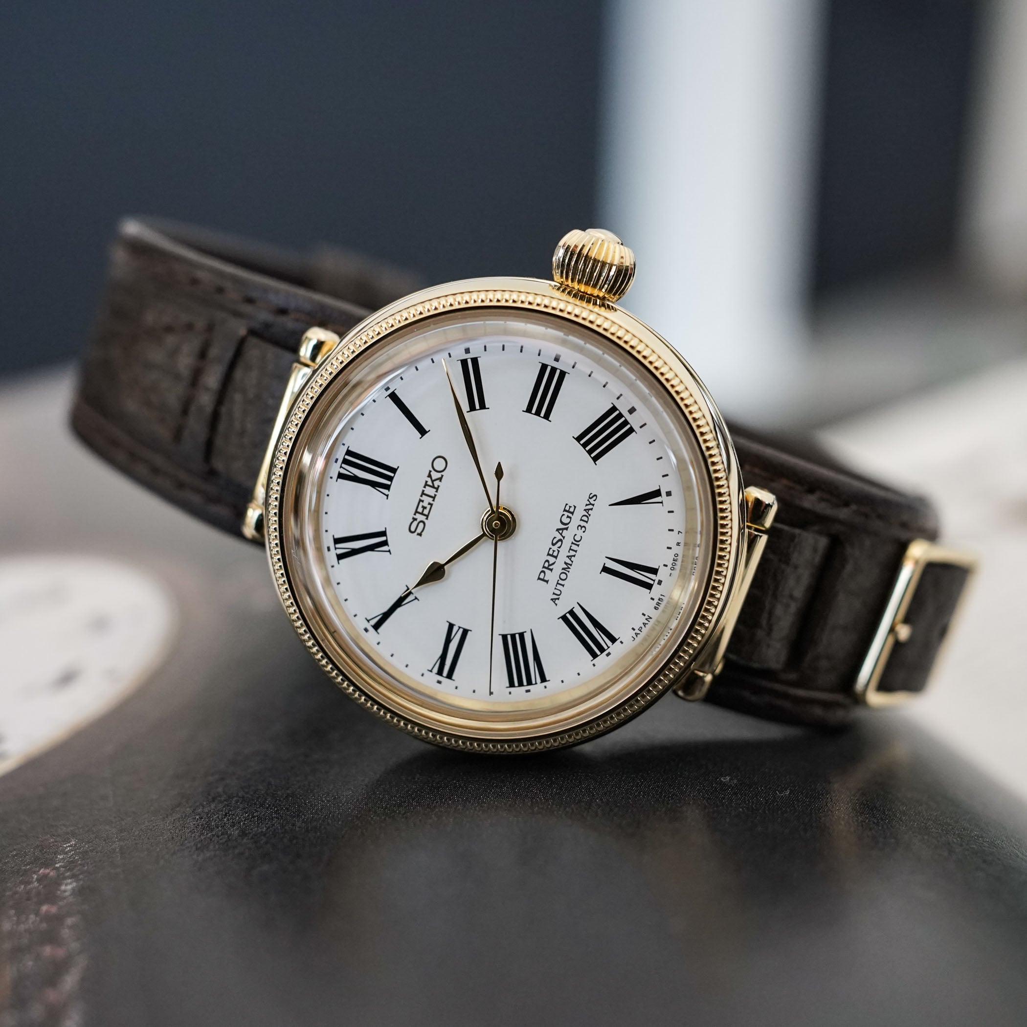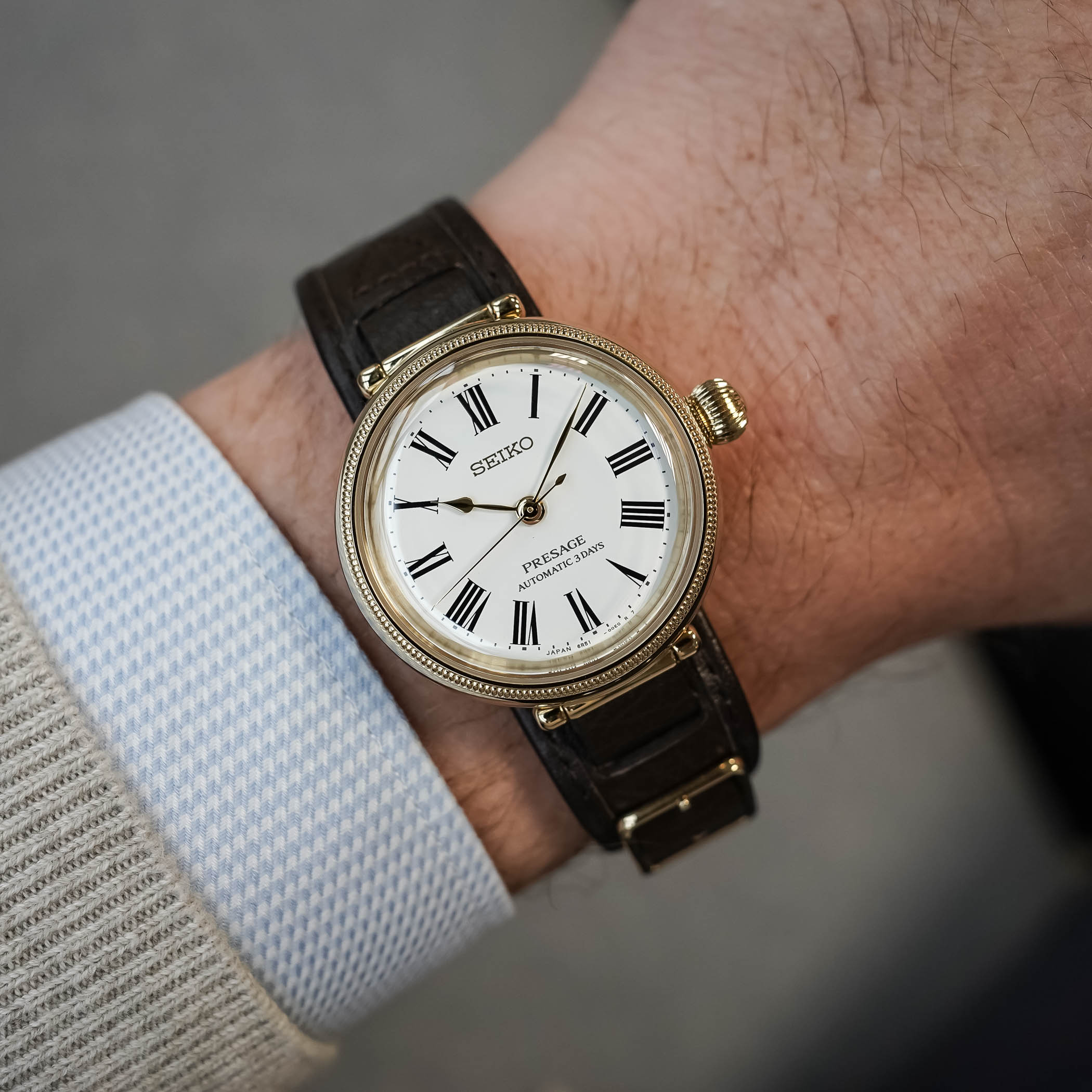 Quick Facts – 35mm diameter x 12.3mm thickness – stainless steel case, gilded – box-shaped sapphire crystal with inner AR coating – solid screw caseback – white enamel dial – black Roman numerals – gold-coloured leaf-shaped hands and applied Seiko logo – onion crown at 3 o’clock – central hours, minutes, and seconds – calibre 6R51, in-house automatic, 21,600vph, 72h power reserve, 24 jewels – 50m water-resistance – magnetic resistance 4,800 A/m – brown leather strap from LWG-certified tanneries with pin buckle – limited to 1,450 pieces – Ref. SPB538 – EUR 2,000