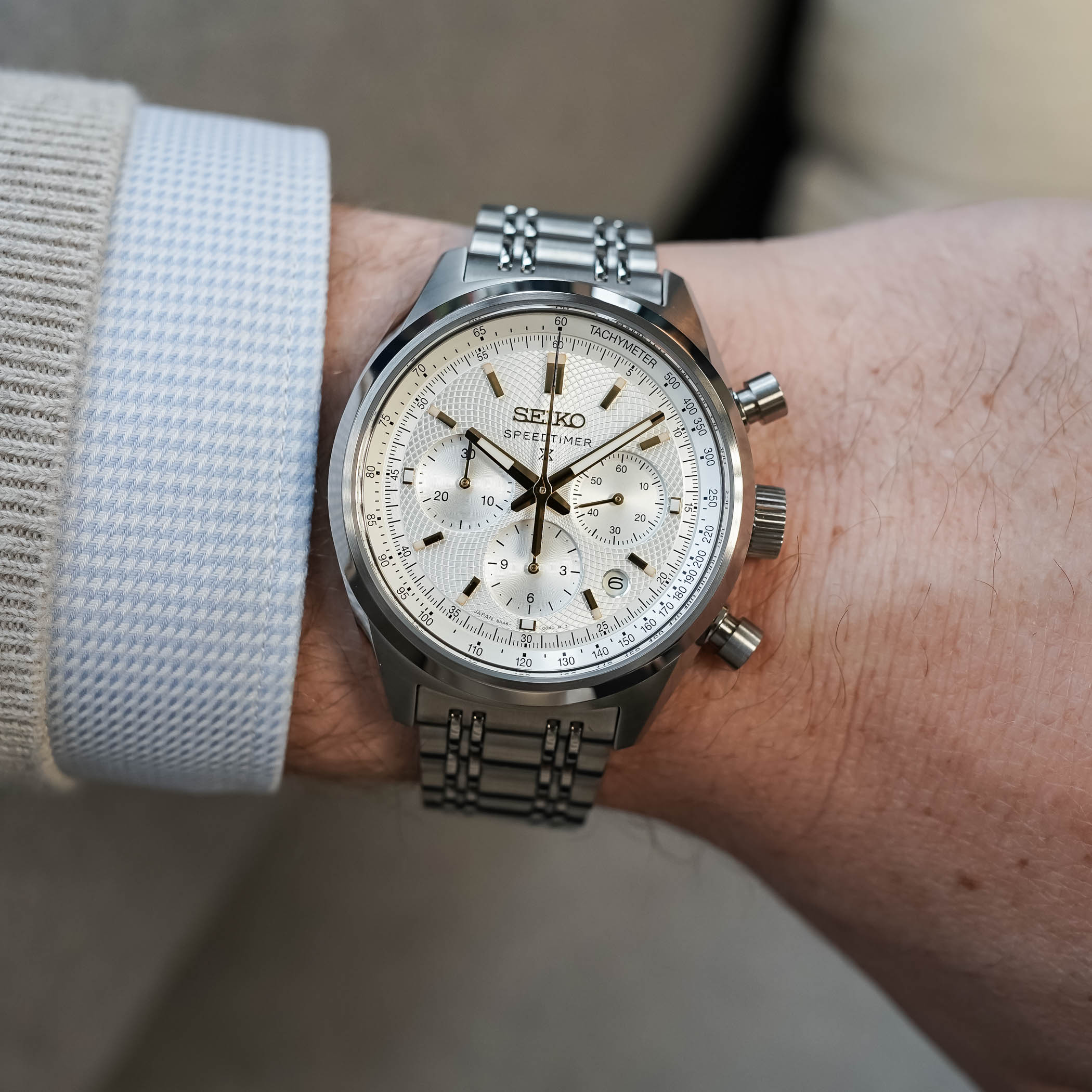 Its gold-coloured hands, indices, and Seiko logo add warmth and a touch of luxury to the crisp, legible dial. The 42mm stainless steel case houses the calibre 8R48, Seiko’s premium in-house automatic chronograph movement with a vertical clutch for smooth operation. It is equipped with MEMS-engineered components for precision.