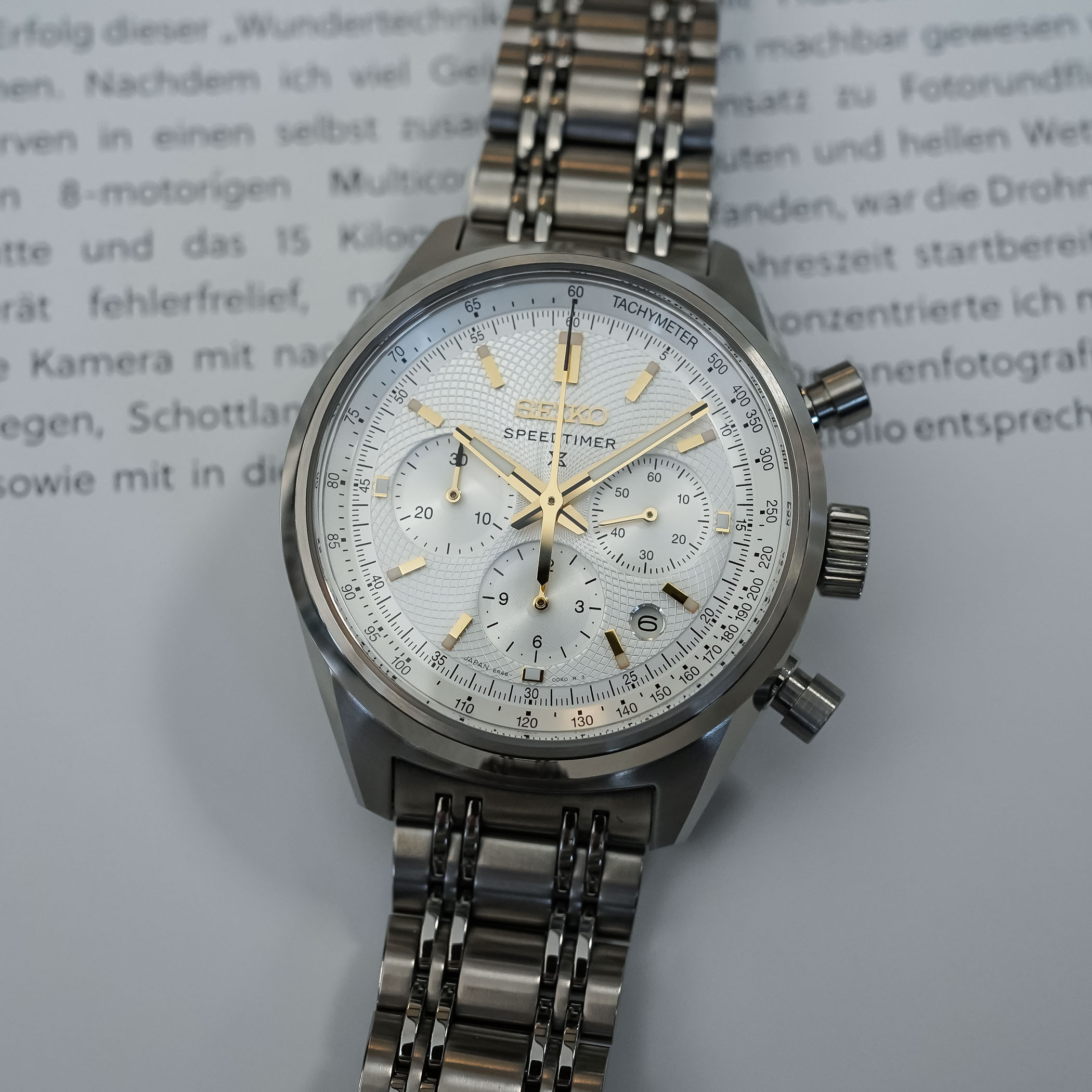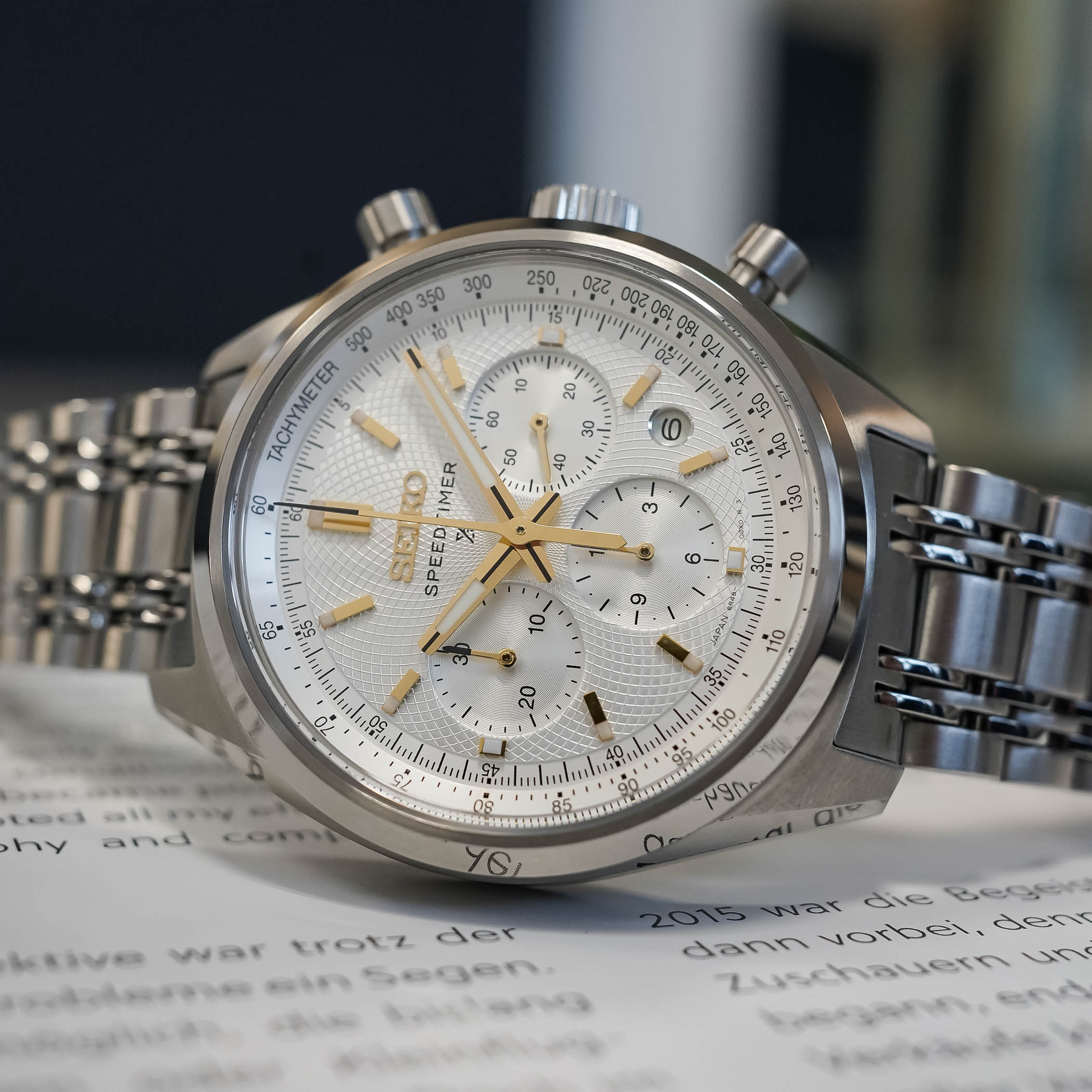 Quick Facts – 42mm diameter x 14.6mm thickness – stainless steel case and bracelet with super-hard coating, brushed and polished – dual-curved sapphire crystal with inner AR coating – screw-down caseback – white engraved-pattern dial with gold-coloured hands, markers, and logo – tri-compax display: 30-minute counter at 9, 12-hour counter at 6, small seconds at 3 – date window between 4 and 5 o’clock – valibre 8R48, in-house automatic chronograph, column wheel and vertical clutch, 34 jewels, 28,800vph, 45h power reserve – 100m water-resistance – magnetic resistance 4,800 A/m – three-fold clasp with push-button release – limited to 700 pieces – Ref. SRQ059 – EUR 2,700