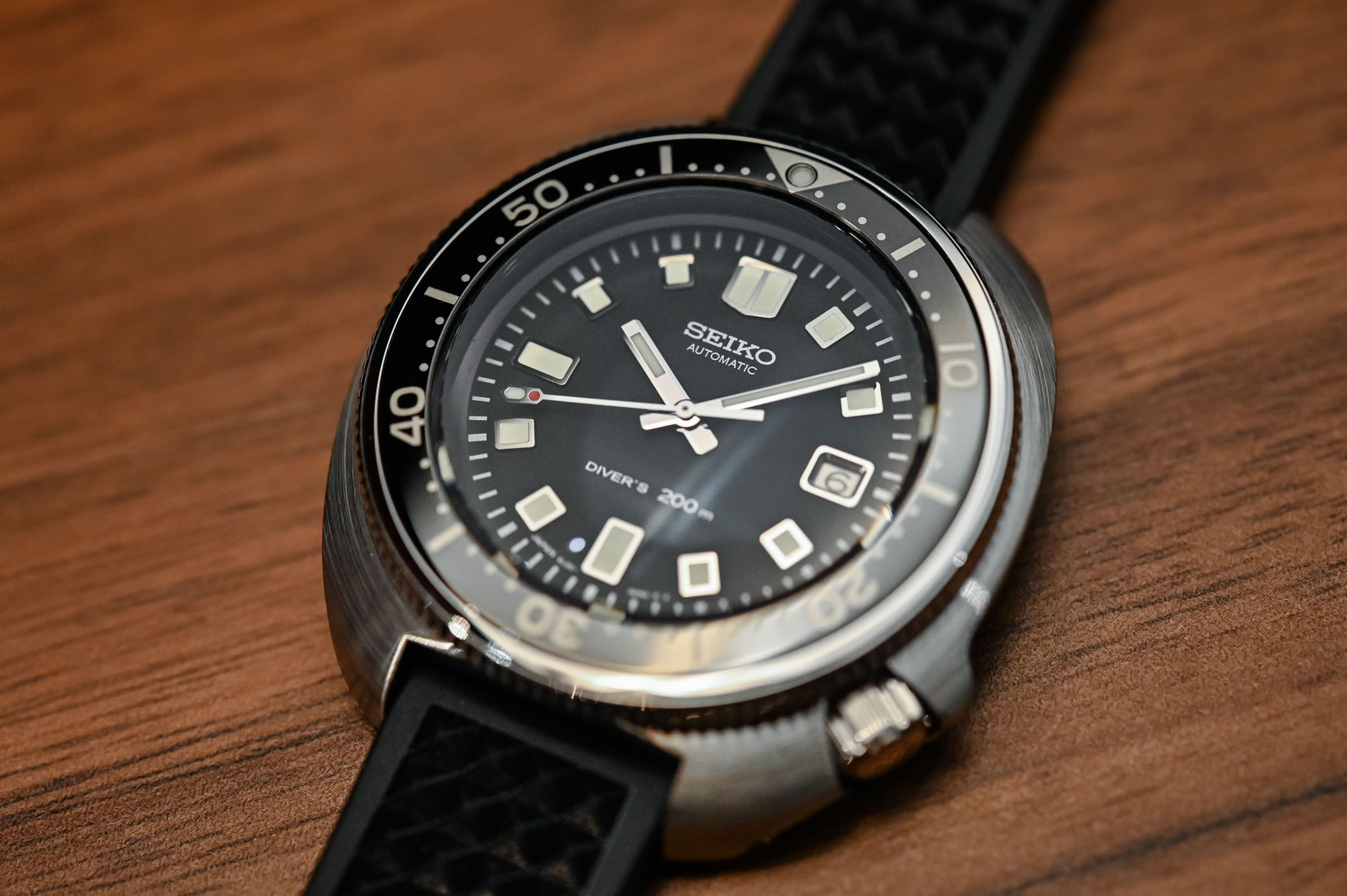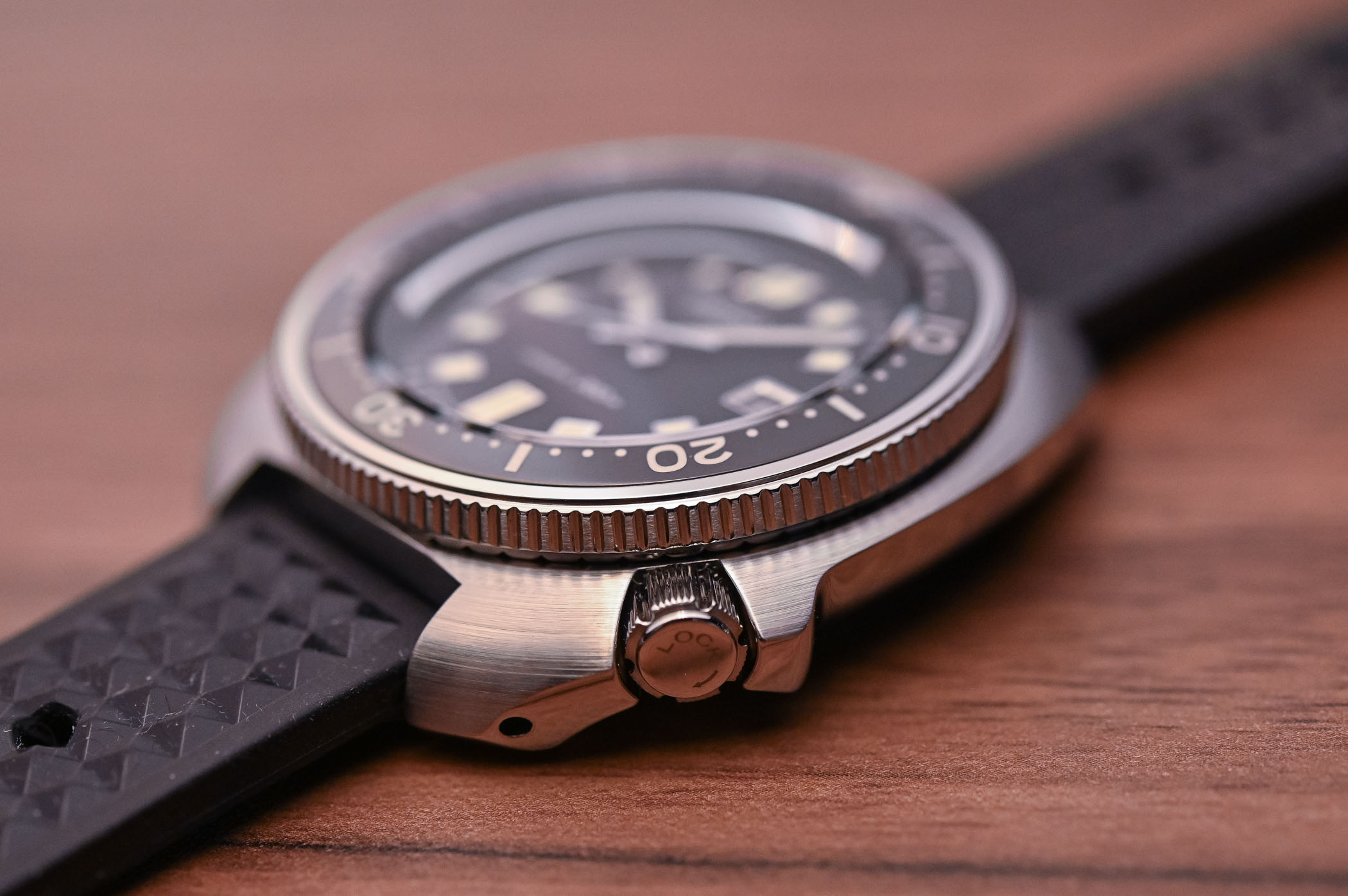 The watch is water-resistant to 200 metres and it is equipped with a screw-down crown. By the way, the crown has kept the “Lock ->” indication that appeared on the original 6105. It adds a vintage touch to the watch (and looks cool). The upper part of the bezel has been polished with the Zaratsu technique. That means mirror-polished surfaces that reflect no distortion at all, where a straight line is always straight, even at the edges. I have seen it done and it is one of the most time-consuming techniques applied to a simple steel case. It is also a source of pride for Seiko, and with good reason.