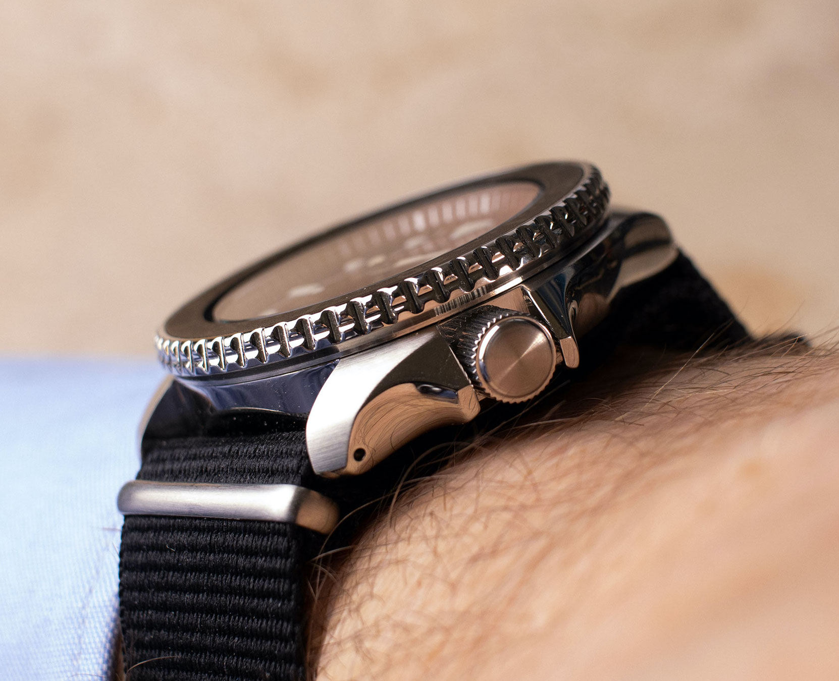 The base of the watch is the new Seiko 5 Sports which in turn was inspired by the discontinued SKX007. It has a 42mm diameter and a thickness of 13mm. The crown is at 4 o’clock and is flanked by two crown guards but not screwed-down. Even so, the water-resistance is guaranteed to 100 metres. The bezel is made from anodised aluminium and the markers are numerals are picked out in an ‘old gold’ colour. The flat glass is Seiko’s Hardlex glass and is placed just below the bezel for additional protection.