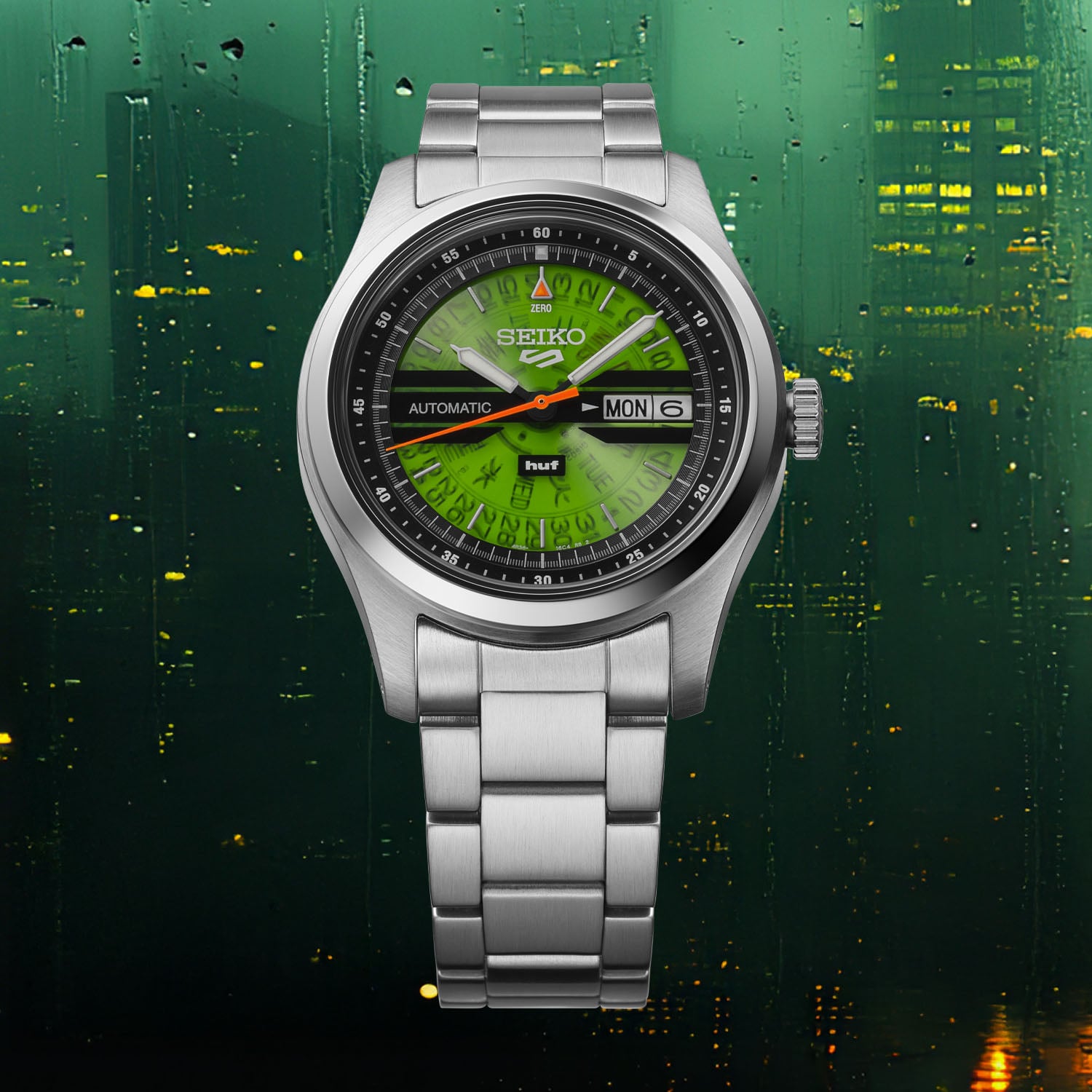 A limited run of 7,000 pieces, the Seiko 5 Sports HUF Limited Edition SRPM09 will be available in March 2026 and priced at EUR 410. For more details, please visit www.seikowatches.com.