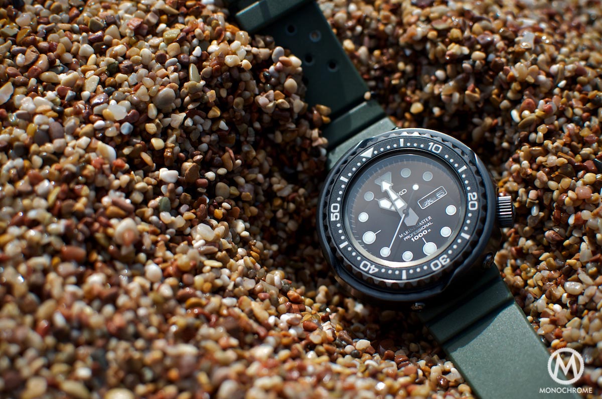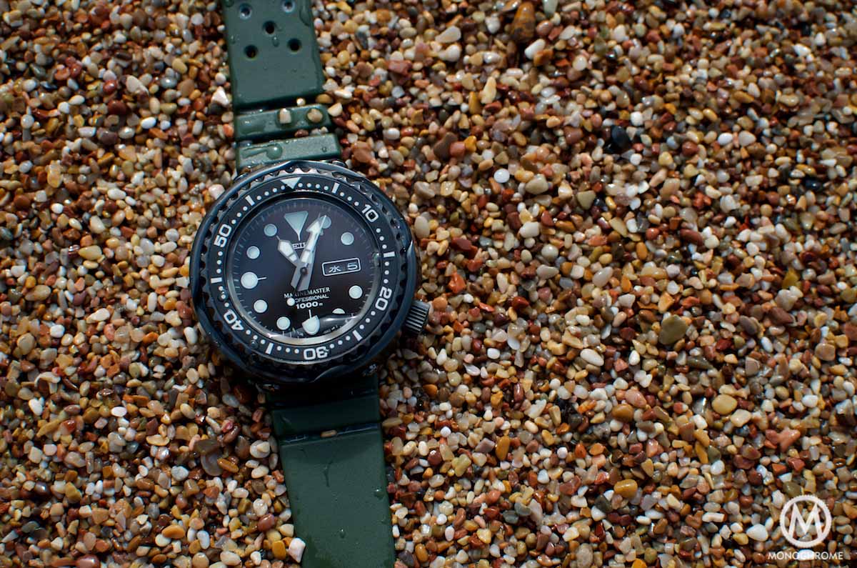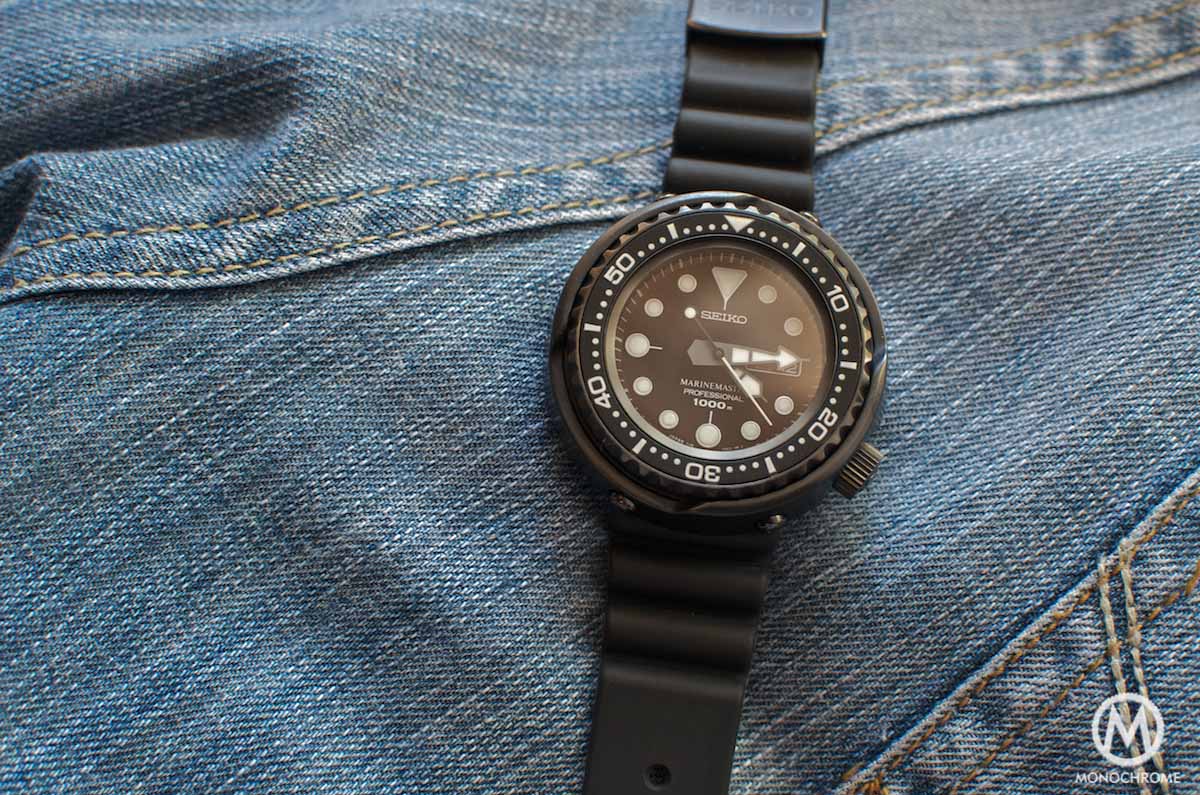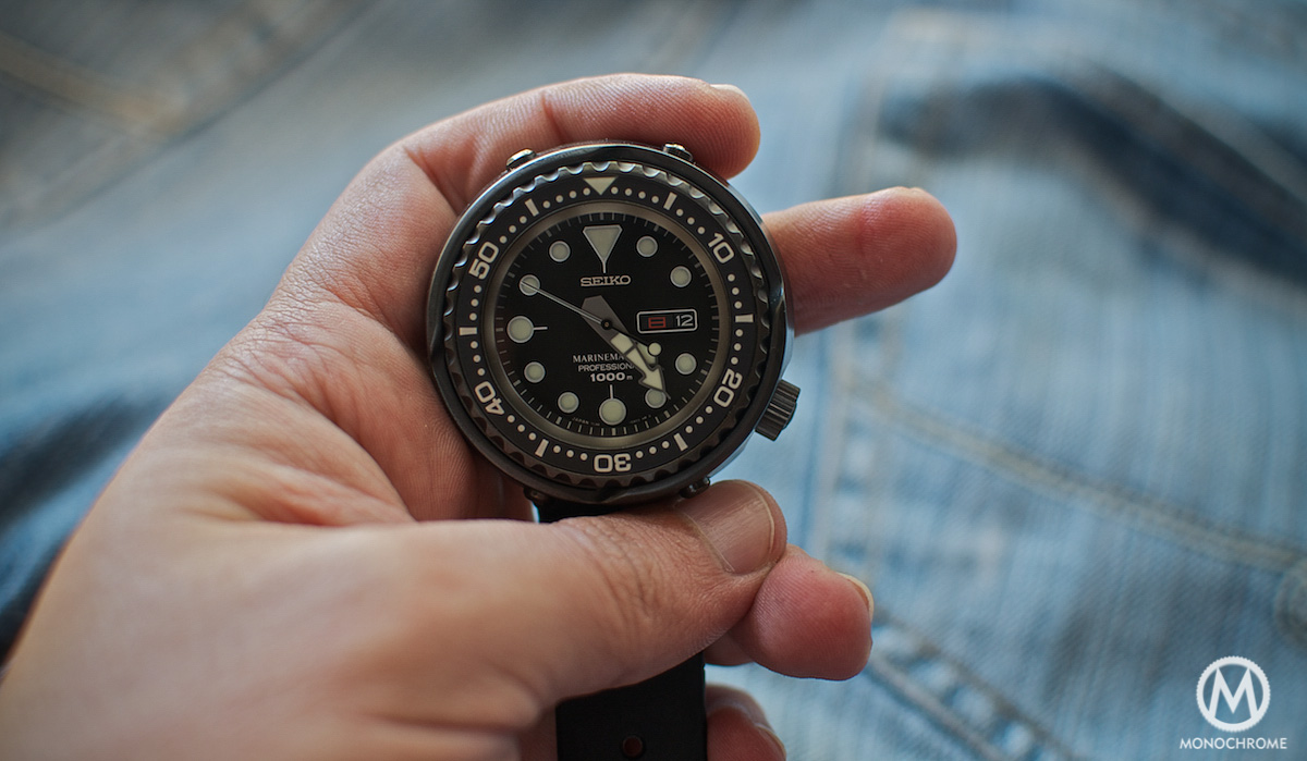 Last week article was a prequel, a necessary “mise-en-bouche” for the long-time and highly personal review of the Seiko Darth Tuna SBBN013 Prospex that you’re about to read. The Seiko Tuna is an important, yet iconic watch, a pioneer on its own – and a collection that boasted during its 40 years of life many innovations, with one and only goal in mind, satisfying the professional divers with an efficient and reliable instrument. It was important to learn first about the history of Seiko Tuna before moving to this review of the Seiko Darth Tuna SBBN013 Prospex. Now you’ll certainly ask yourself why a quartz watch came to be reviewed on Monochrome? Well, in one word, just be aware that it’s not every cheap quartz watch, it’s a Seiko Prospex. And if it has a quartz movement, it’s just to be even more reliable, secured and precise. After a review of the entry-level Seiko SKX007, it’s time now to move to serious watches, with the Darth Tuna SBBN013.