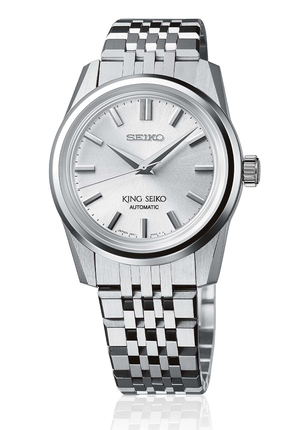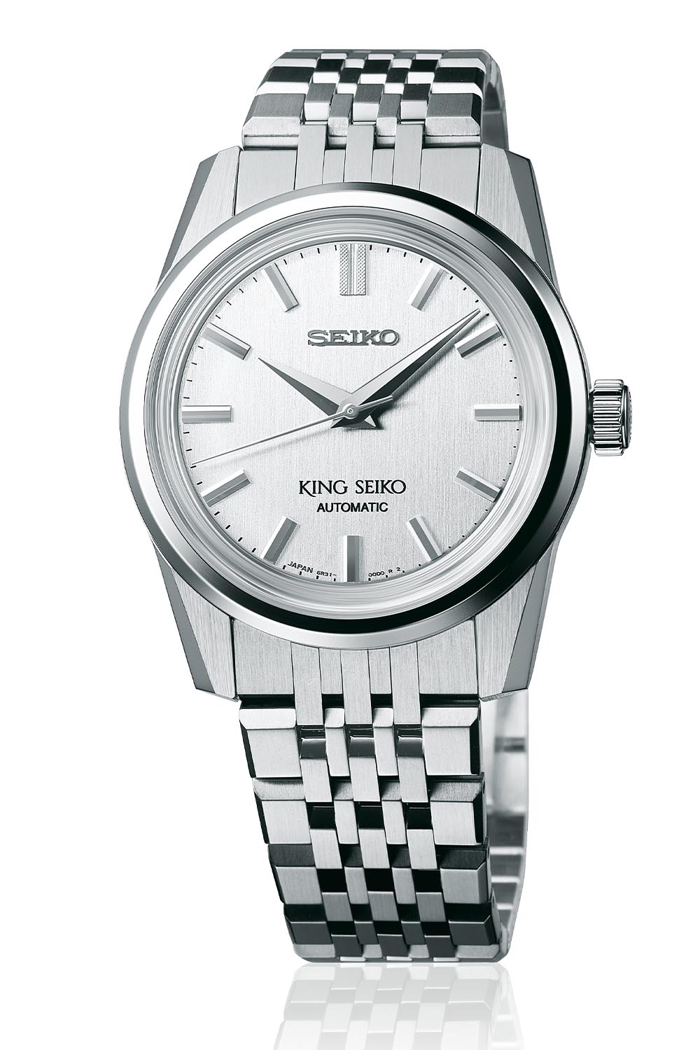 To complete the very retro-like appeal of the new King Seiko collection, it comes on a stainless steel multi-link bracelet, very much like the one on the original 1965 model. The faceted links, tapering from case to folding buckle, have a brushed finish with polished bevels. As an alternative option, each reference is also supplied with vintage-styled leather straps with a pin buckle bearing the King Seiko name.
