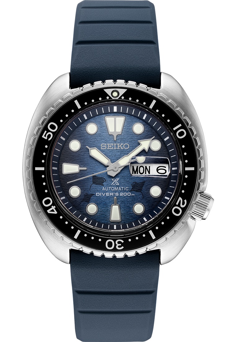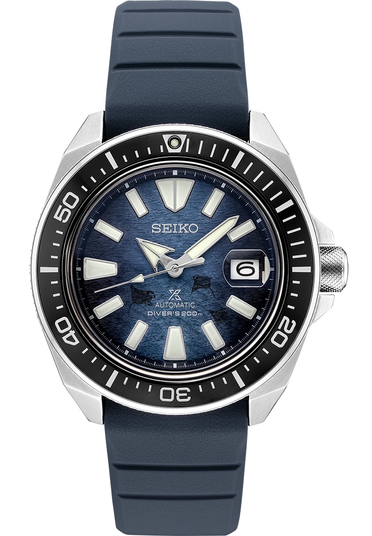 The new “Save The Ocean” SRPF77 & SRPF79 are based on models recently launched by Seiko, the two “King” watches. Basically, these are upgraded versions of some of the Seiko bestsellers, the Turtle and the Samurai. The idea was to provide more resistance to external aggressions with upgraded materials. Still, the cool design of both watches is kept intact, with the exception of a new patterned and manta-inspired grey-blue dial produced this year – a colour that Seiko cherishes since last year – and a new silicone strap.
