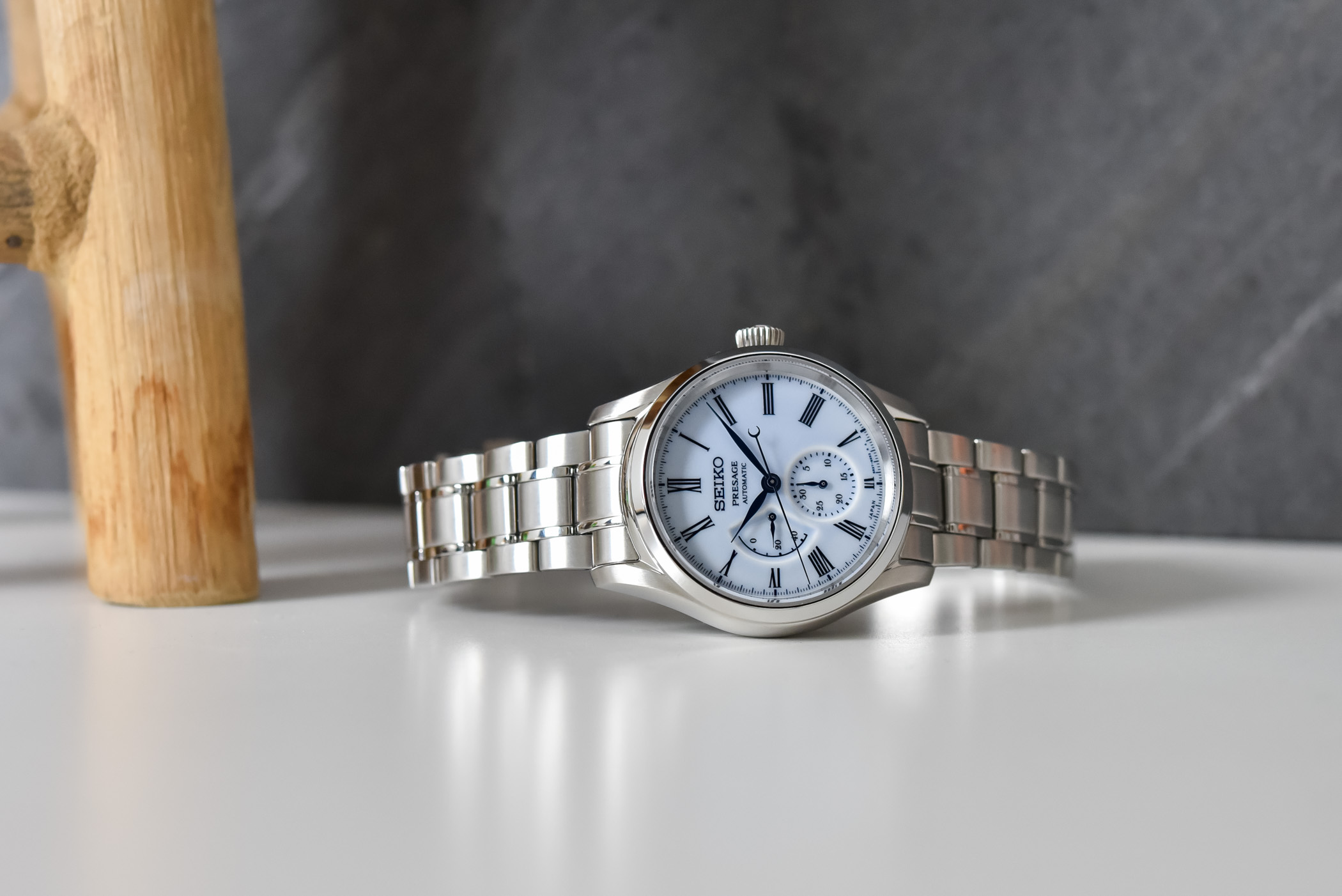 For the rest, no surprises with this Seiko Presage Arita Porcelain SPB267J1. The steel case is the same as previous editions, with its comfortable 40.6mm diameter but a rather hefty thickness of 14.1mm – which is obviously too much for such a dressy, elegant watch. On the other hand, the watch is water-resistant to 100m and features a dual-curved sapphire crystal on top, as well as a see-through caseback. The shape and the finishing are pleasant, with a combination of curves and facets, highlighted by brushed and polished elements.