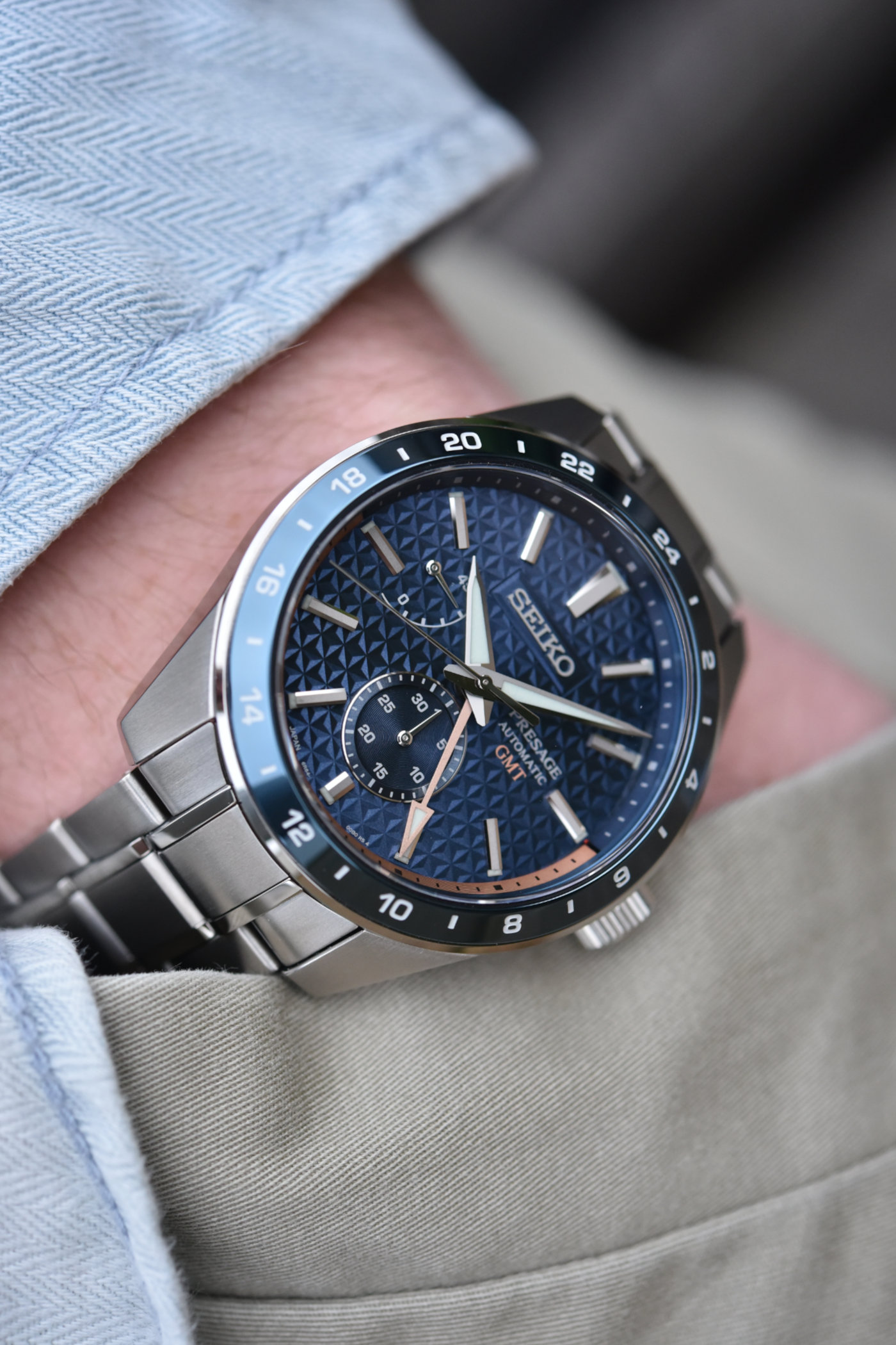 I have to admit that when I first glanced at the Sharp Edged GMT, I thought I was looking at a Grand Seiko Sport GMT Spring Drive. The strong lines, the angular surfaces, the sharp facets, the robust lugs, the colourful textured dials and the alternating brushed and polished surfaces are so similar that a preliminary glance can be misleading. And no doubt Seiko intentionally promoted this similarity to attract a wider audience that couldn’t fork out EUR 6,400 for a Grand Seiko GMT but would happily put down EUR 1,500 for a well-built Seiko GMT.