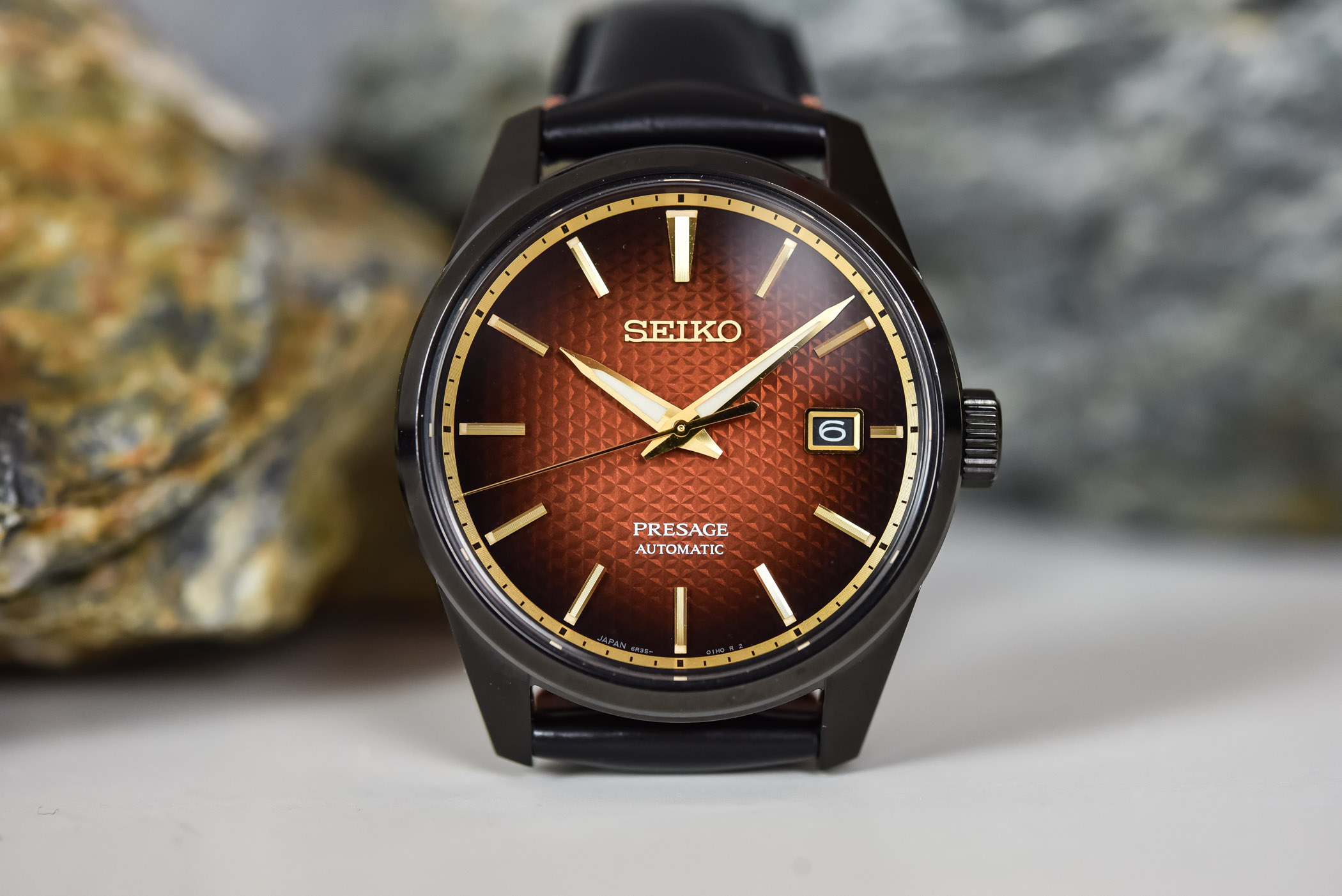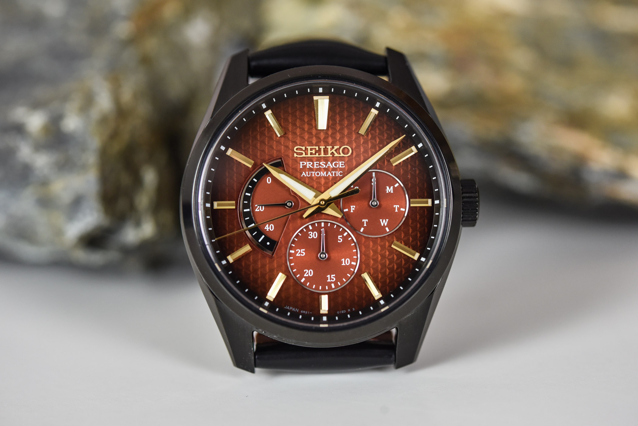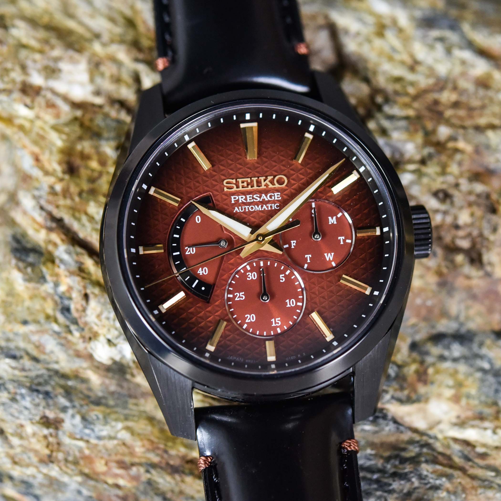 The second watch in this new Presage Sharp Edged Kabuki series is the reference SPB329. Visually, it shares most elements with the aforementioned time-and-date watch – black coated case, red-brown gradient dial, gold-coloured hands/markers, black leather strap with red accents. However, it brings more complications on its dial, and also slightly different proportions.