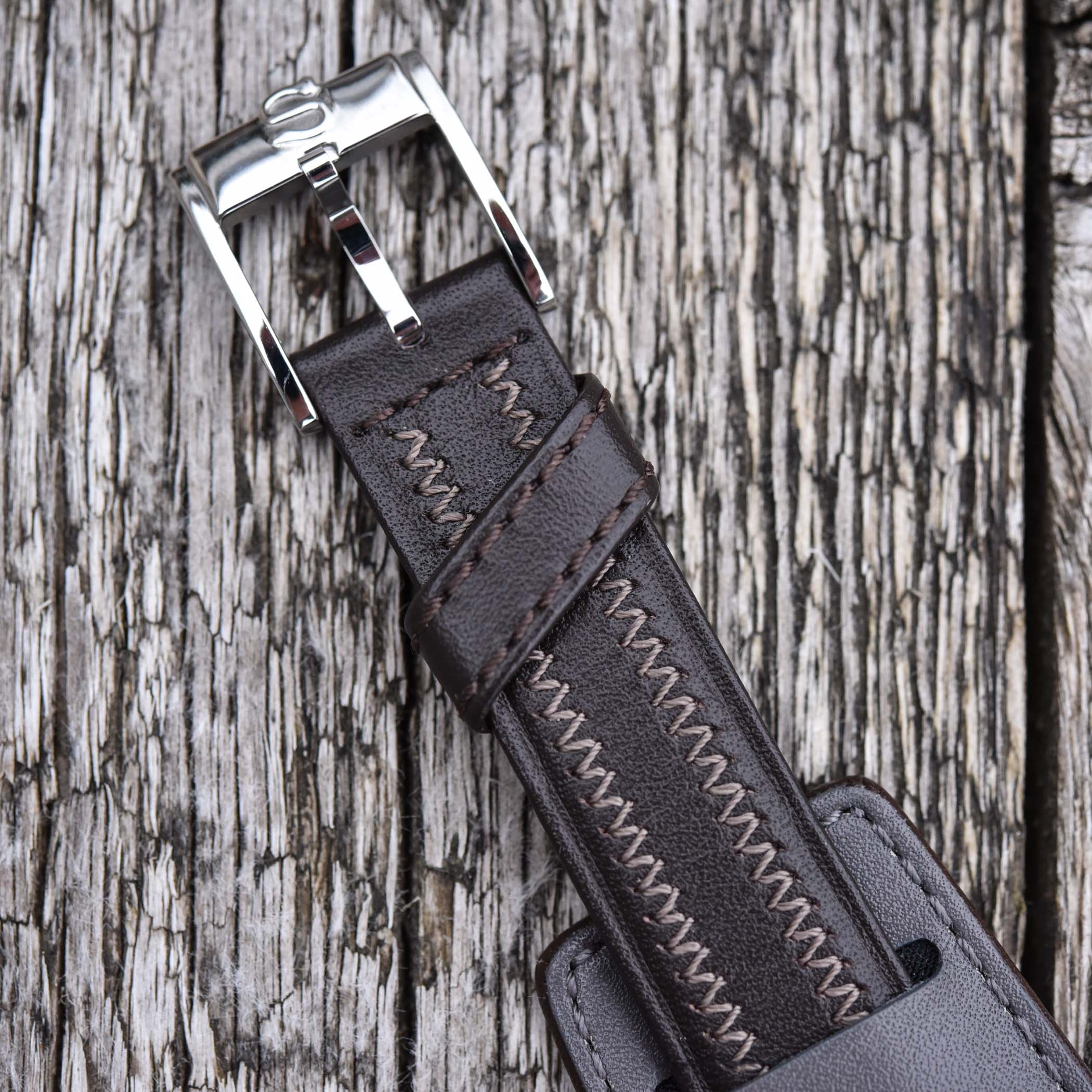 Now comes the strap. The idea of Seiko was to offer something identical in style to what was used by Yama-Otoko on their Laurel Alpinist watches. This means a brown 2-part calf leather strap with an original, distinctive jagged stitching, and underneath a grey leather protective cuff band. If I can salute the effort in terms of design and boldness, the problem for me is that this cuff band somehow negates the cool compactness of the case, making the watch fairly big on the wrist (note that it is here worn by Robin, who’s 2 metres tall). Personally, I’d remove this cuff and would wear the watch on the traditional strap only. Once again, to each his own. It is closed by a nicely executed steel pin buckle with an old-school design.