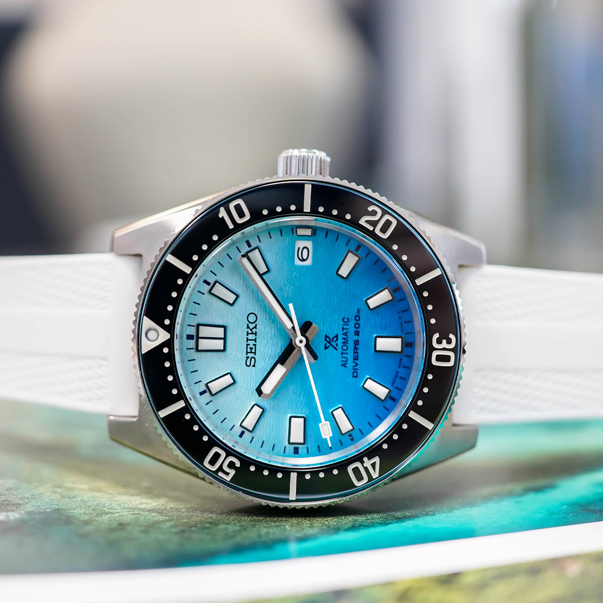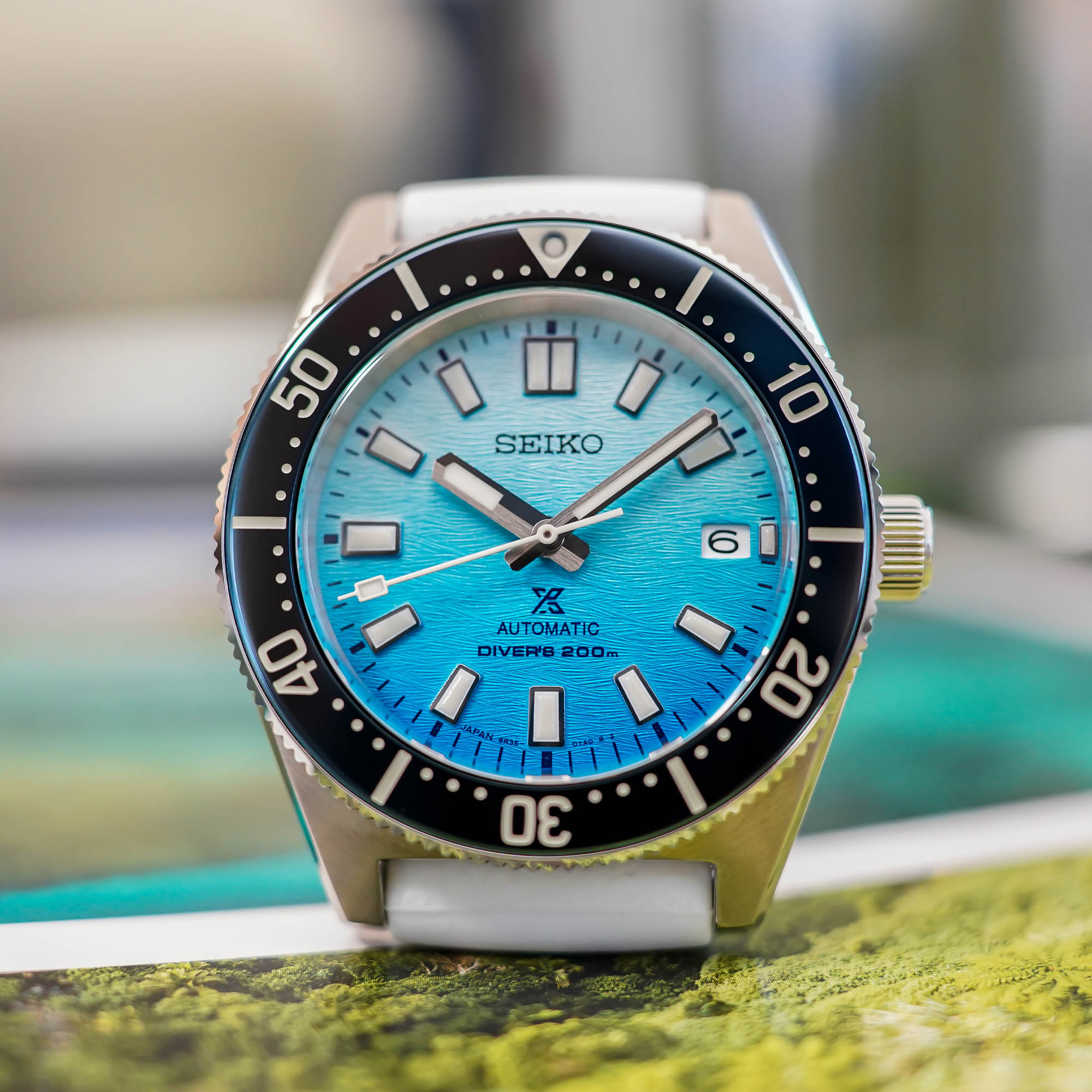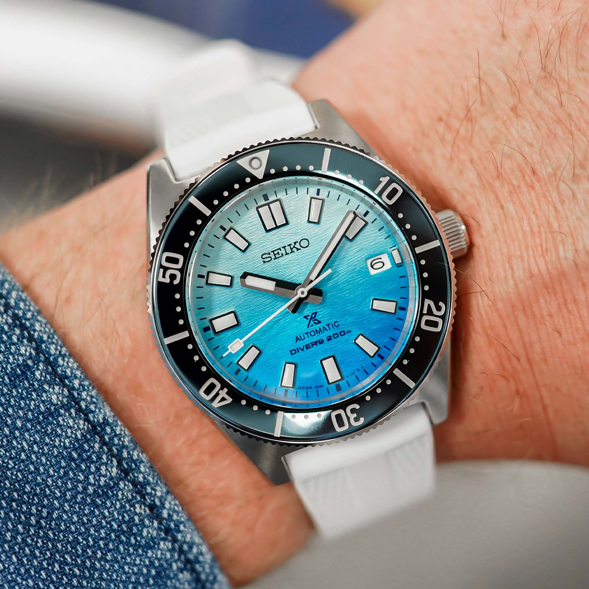 Let’s move to the specificities of this “Zakynthos” SPB473 edition. First, while the bezel is traditionally unidirectional, with 120 clicks, it features a new insert with a glossy effect – it’s not ceramic, even though it looks like it – and a very dark blue colour. Also, in addition to the 3-link, brushed stainless steel bracelet, Seiko adds here a white silicon strap that will surely look the part on a white sand beach somewhere in Greece.
