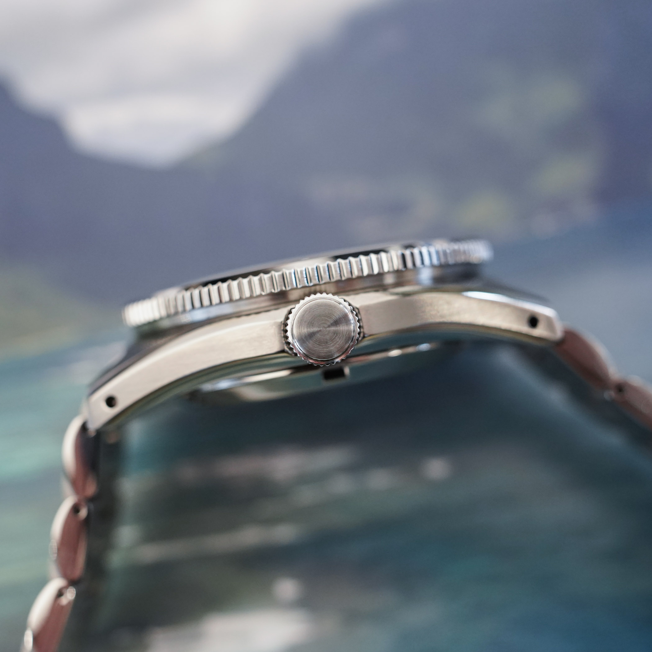 What’s new isn’t the case made of stainless steel case with super-hard coating, but the bezel’s insert has been updated here in a new grey colour. It is still metallic with a matte surface and a white 60-minute scale with a luminous pearl. Of course, this bezel is unidirectional. The back is still solid steel and screwed, the crown screws down and the dial is protected by a curved sapphire crystal with AR coating on the inner surface.