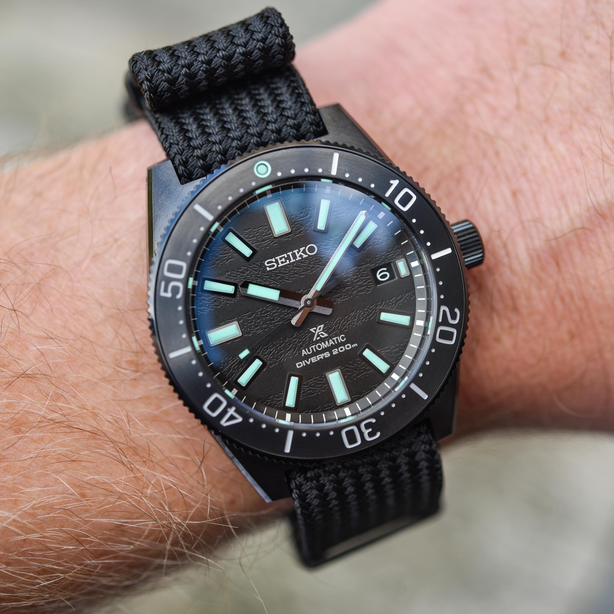 Being based on the 62MAS, this new SLA067 shares its construction with models like the recently introduced SLA065. This means we have a 41.3mm wide and 13.1mm tall stainless steel case, but this time coated in black obviously. The black dial has a unique texture, which to us, resembles the floor of an ocean or lake in a way. The applied indices and hands all have a mint-green LumiBrite insert, a fun little tone of colour to the otherwise fully black SLA067. The water resistance is rated at 200 meters.