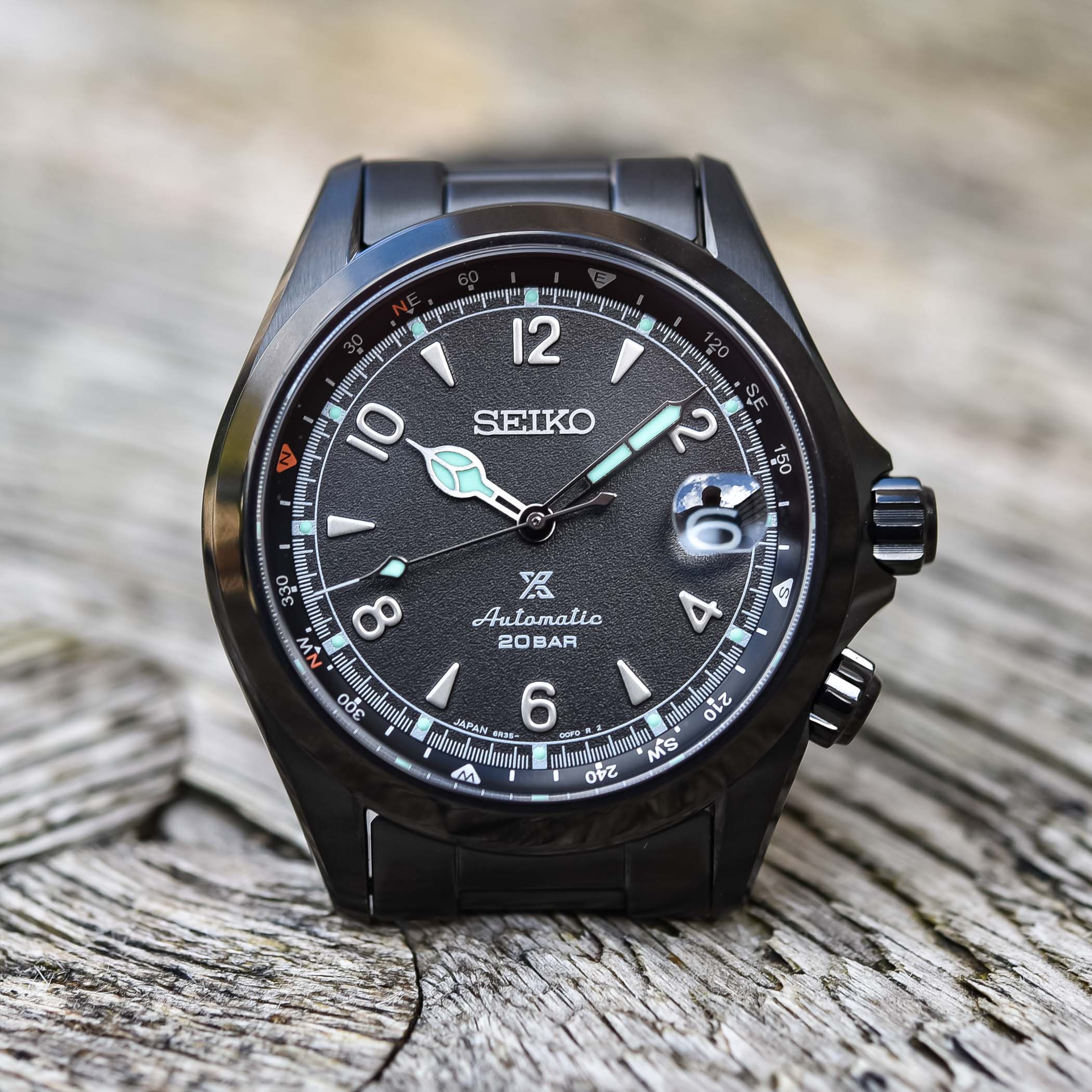 Rounding up this trio of blacked-out tool watches is another Seiko classic, the Alpinist. This new reference SPB337 combines the iconic dual-crown look of the modern Alpinist collection with stealthy attire. At 39.5mm in diameter and 13.2mm in height, it’s sized rather pleasantly. The signature cyclops over the date is there, as well as the secondary crown to manipulate the inner bezel. The dial shows a similar texture as the Diver SPB335 above, with again applied indices and mint-green LumiBrite touches. This too is rated at 200 meters of water resistance.