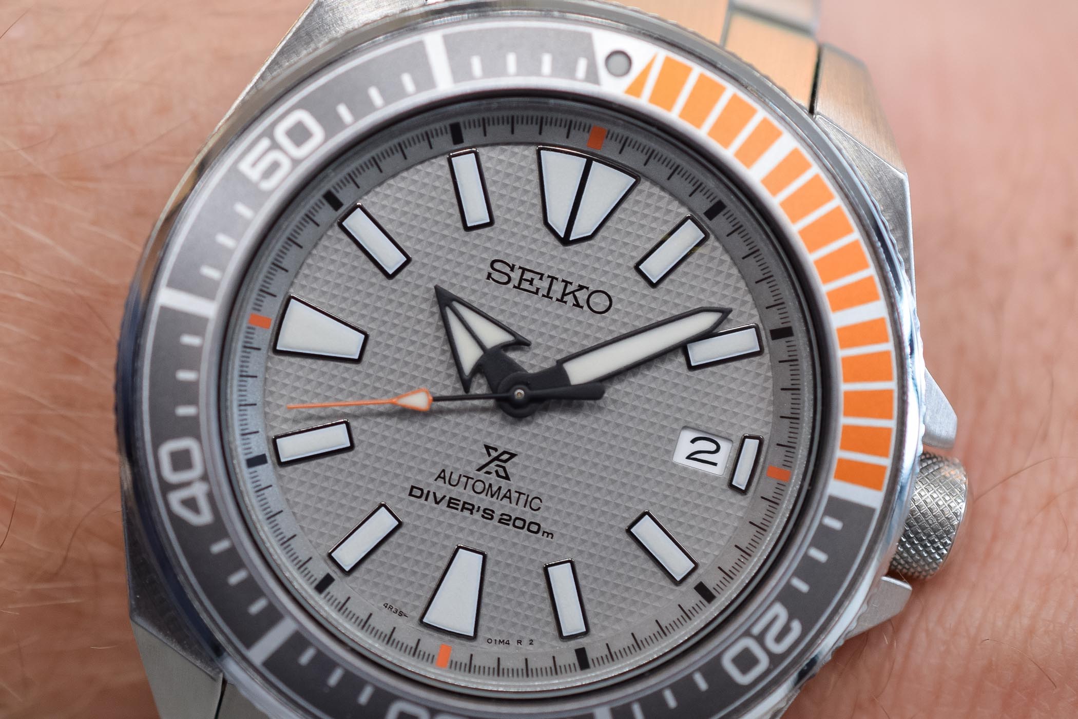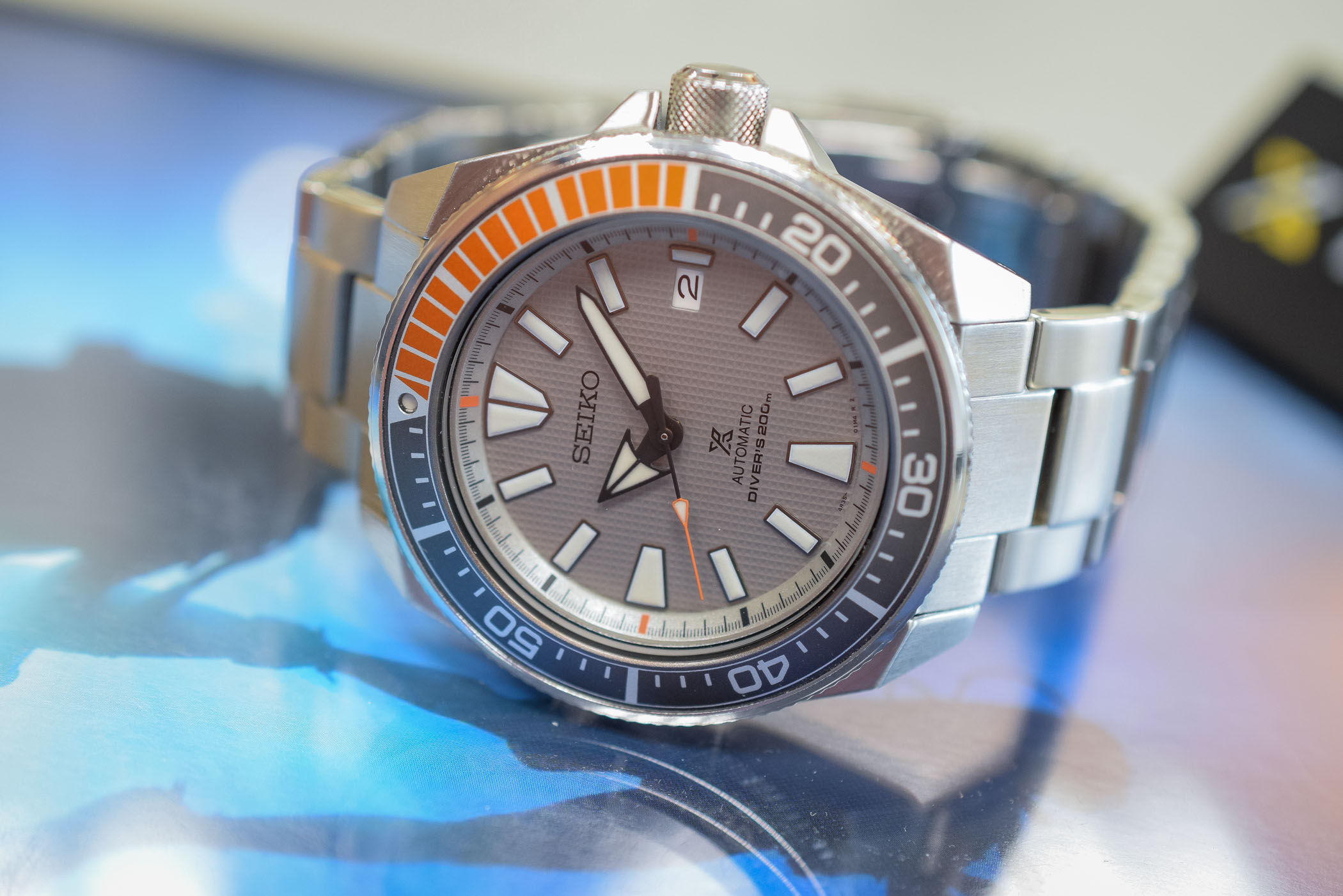 The Seiko Prospex SRPD03K1 Samurai “Dawn Grey” follows the same path as its Turtle brother. Again a large steel case, this time measuring 43.8mm across and 13.4mm thick. The difference is in some of the coloured details. The hands are different, but again white on black with an orange-tipped seconds hand, and a grey dial with a Clou de Paris decoration. The dive bezel picks out the first 15 minutes in orange and the remaining area in grey.
